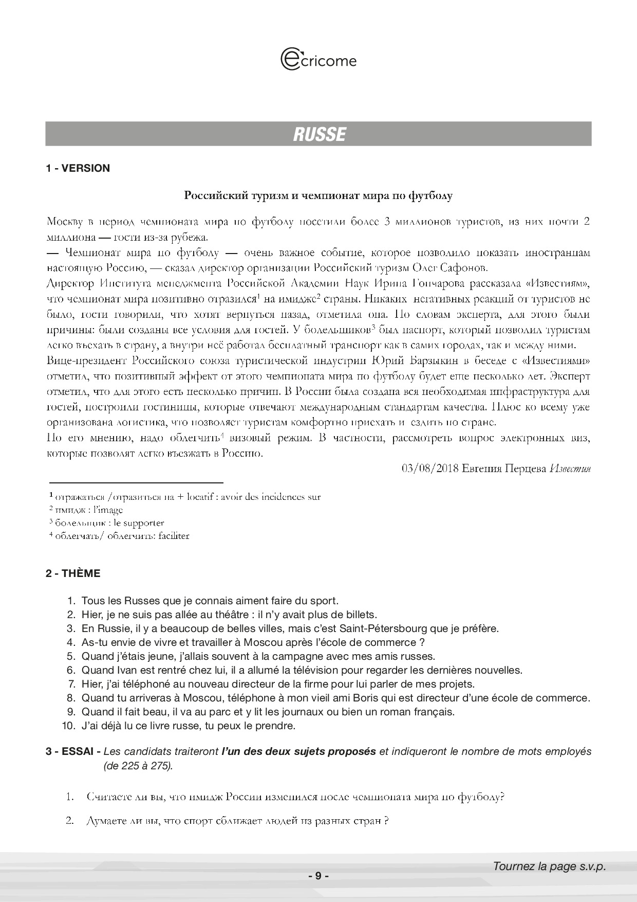 Concours Ecricome Prépa 2019 - Russe LV2 (Sujet)