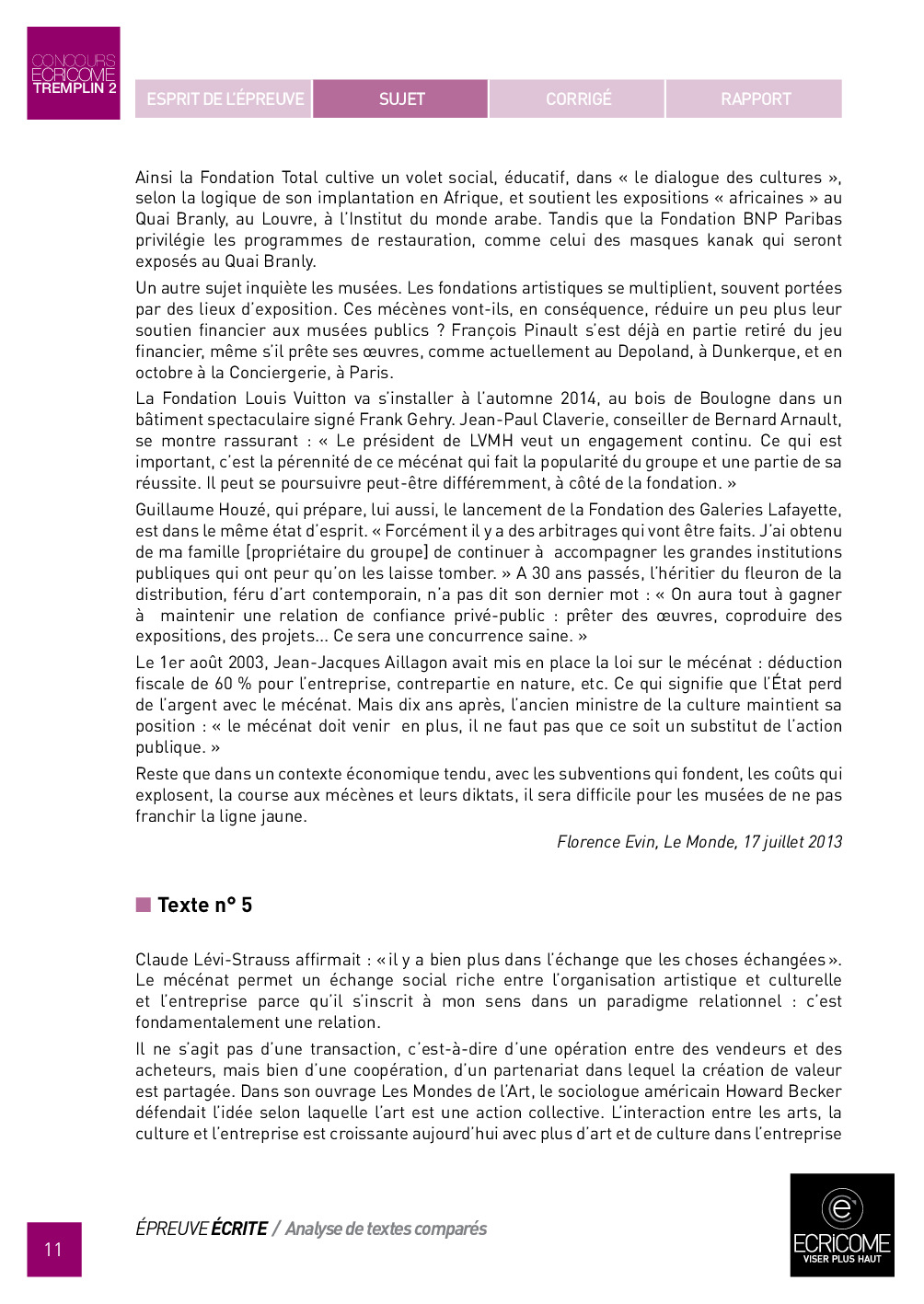 Concours Ecricome Tremplin 2 2014 - Analyse de textes comparés (Sujet)