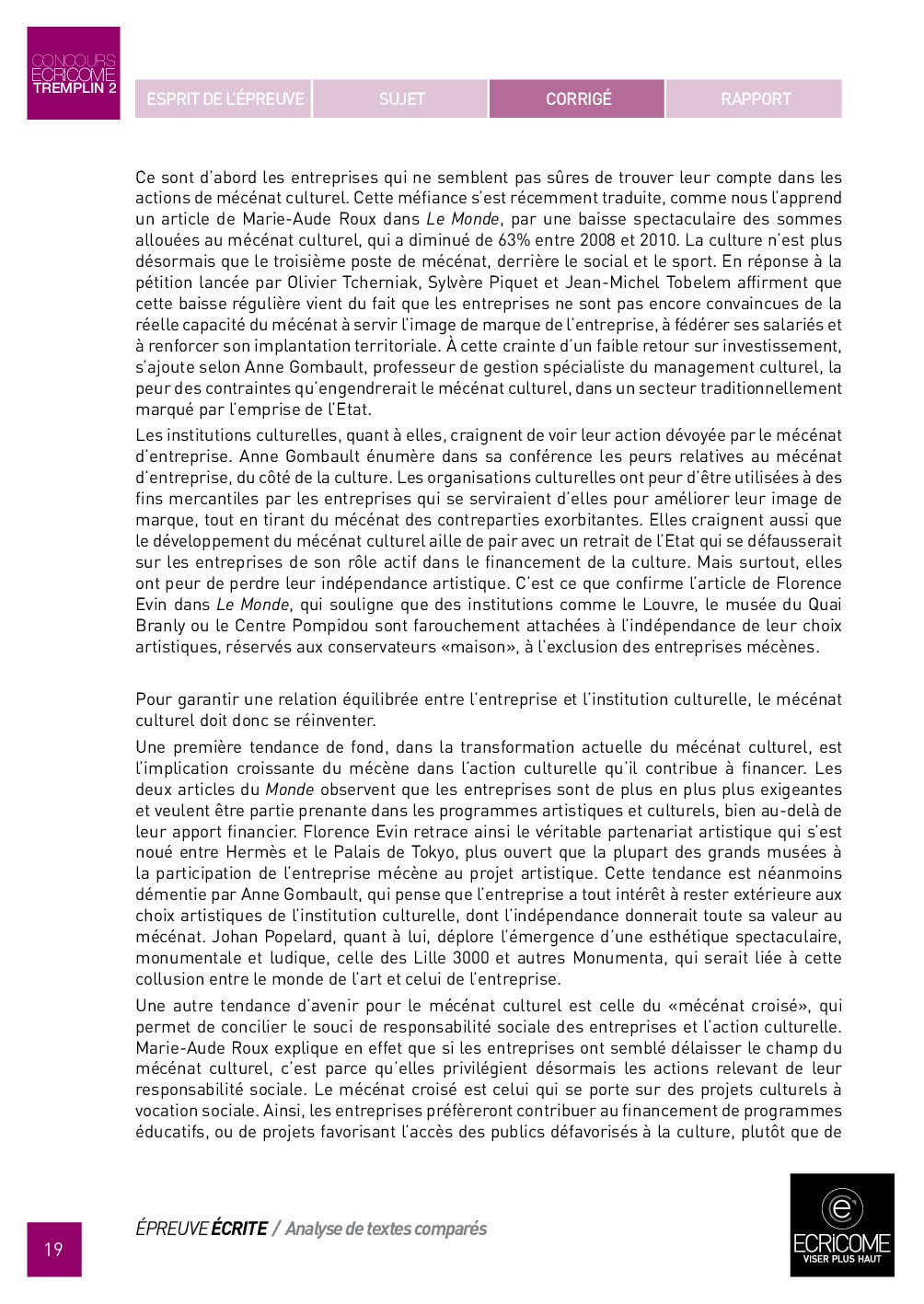 Concours Ecricome Tremplin 2 2014 - Analyse de textes comparés (Corrigé)