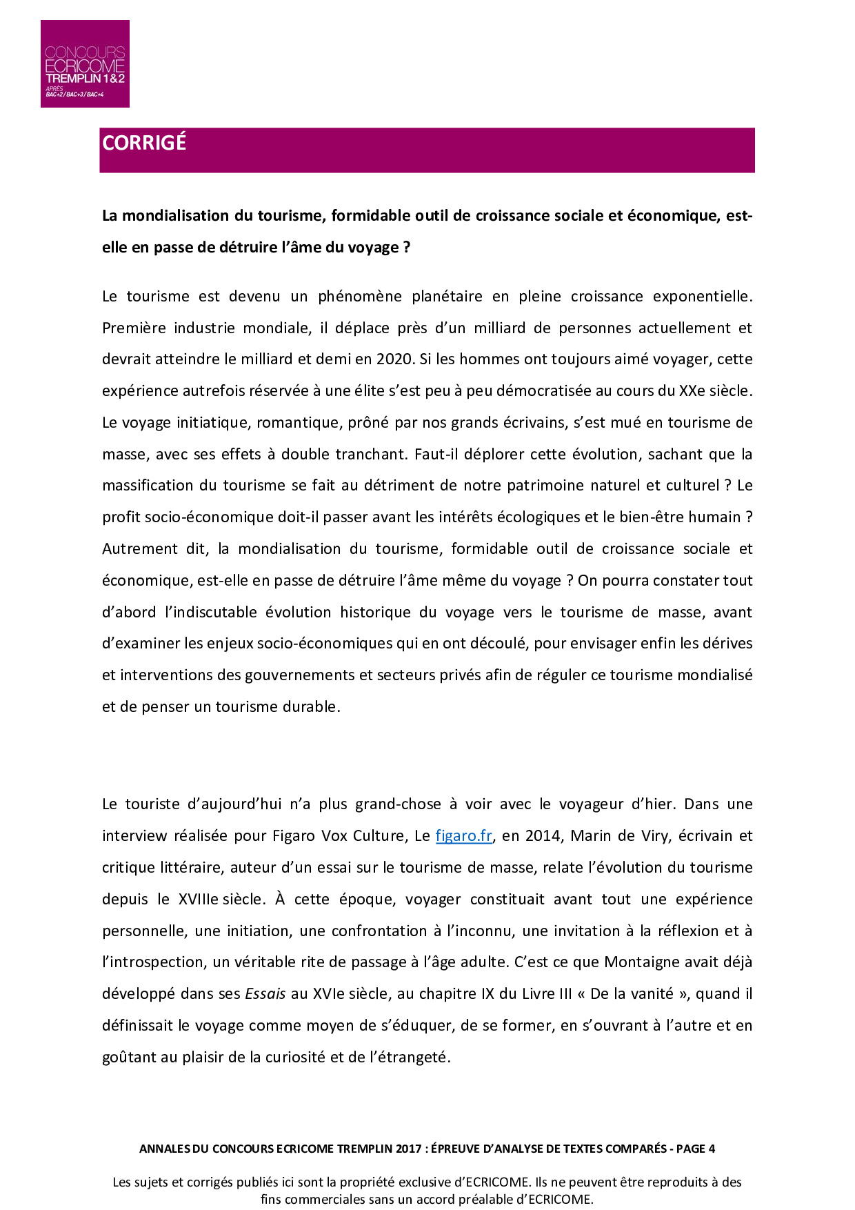 Concours Ecricome Tremplin 2 2017 - Analyse de textes comparés (Corrigé)