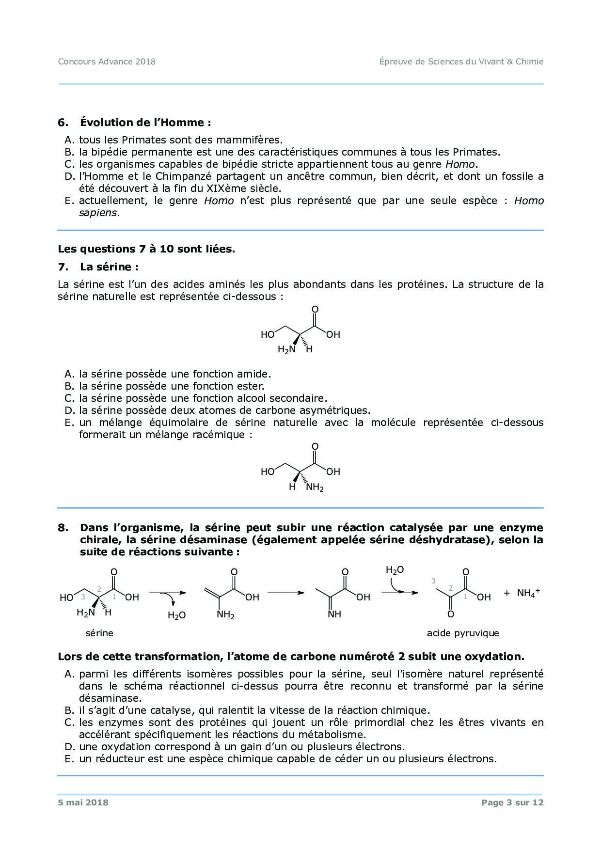 Concours ADVANCE 2018 - Sciences du vivant (Sujet)