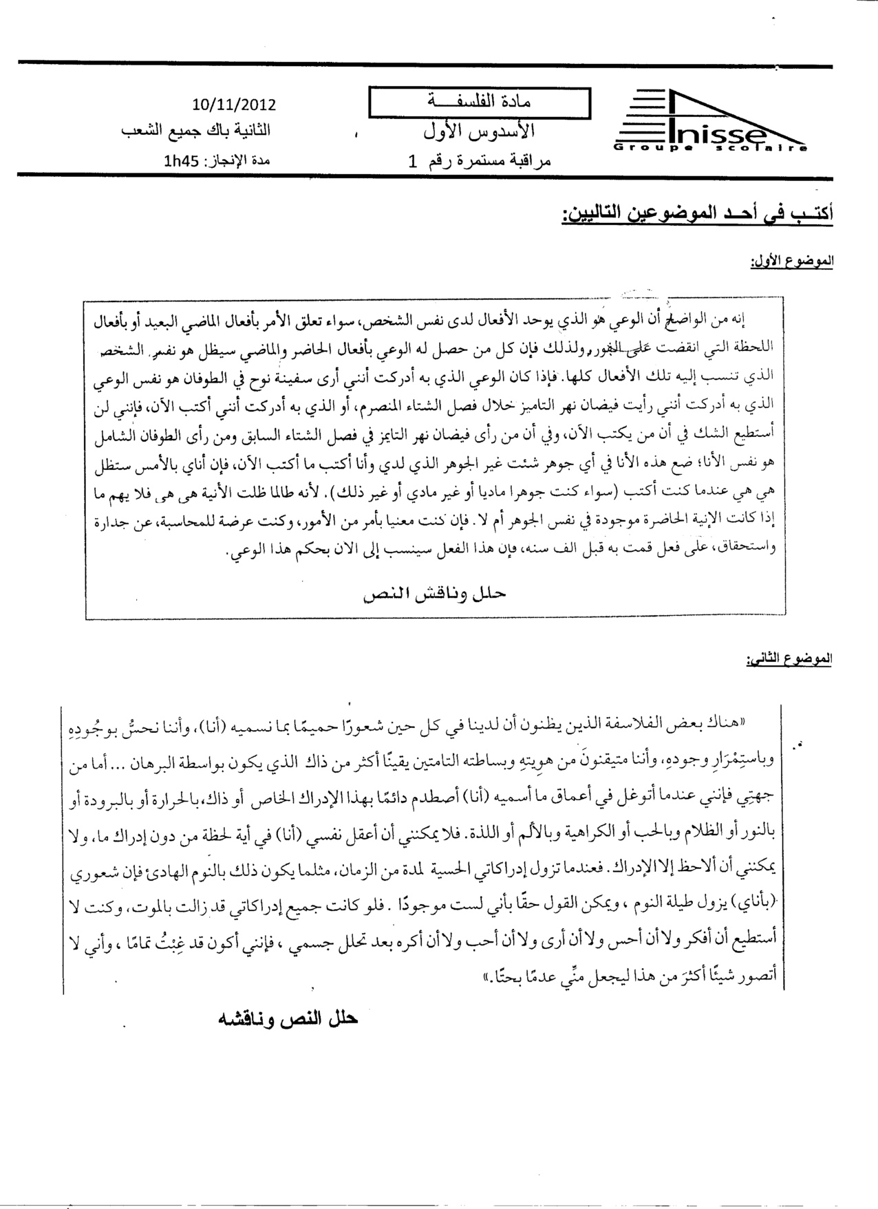 الفرض 1 نموذج 7 - الفلسفة ثانية باك علوم وتقنيات الدورة الأولى