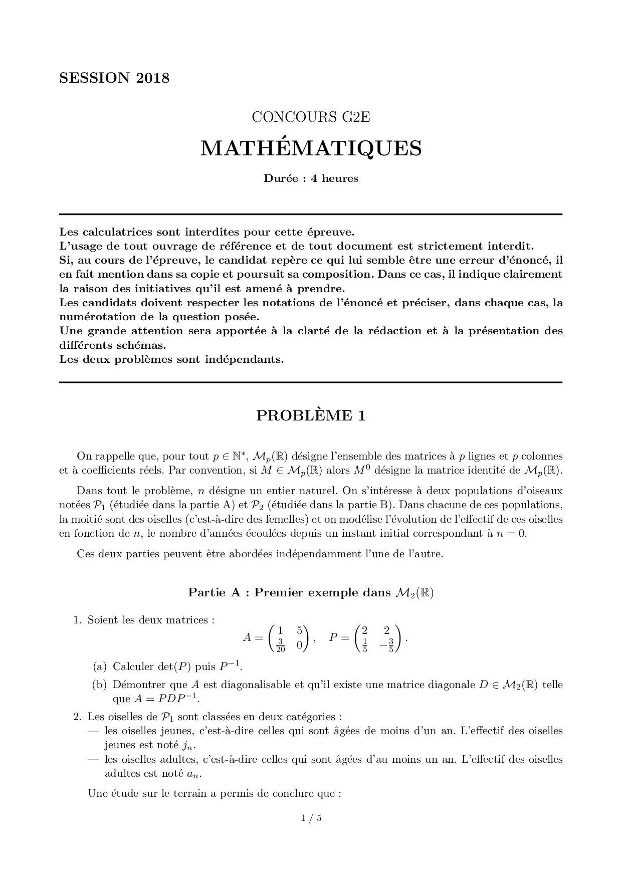 Concours G2E 2018 - Mathématiques (Sujet)