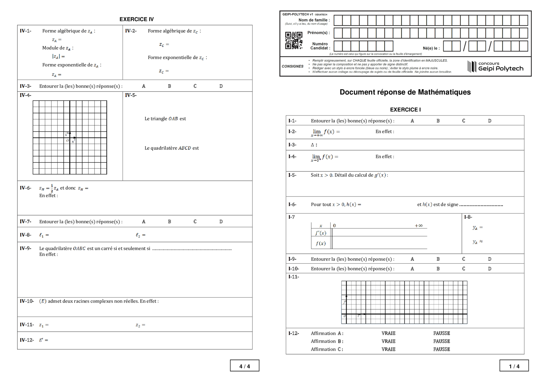 Concours Geipi Polytech 2019 Série S - Mathématiques (Doc réponse)