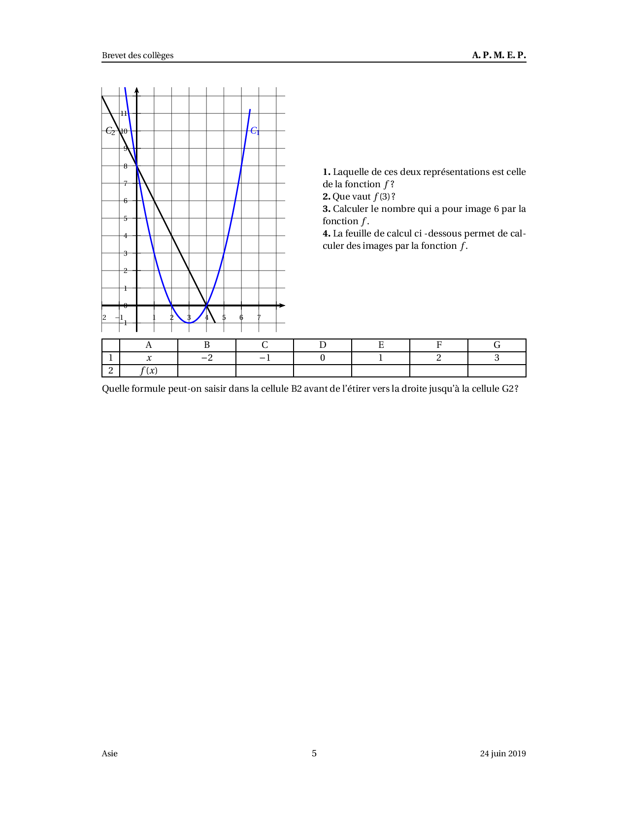 Brevet Maths Asie juin 2019 - Sujet