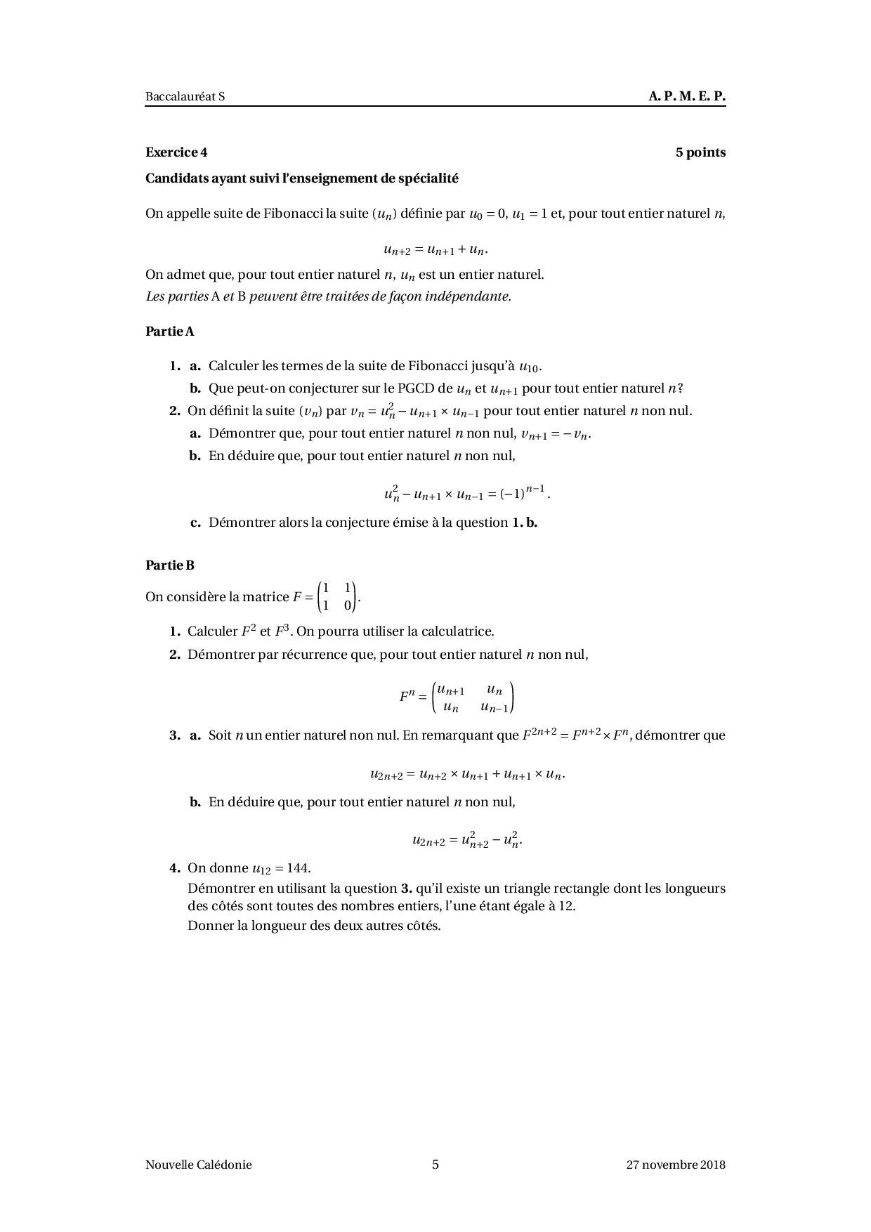 Annale Maths Bac S Nouvelle Calédonie novembre 2018 - Sujet