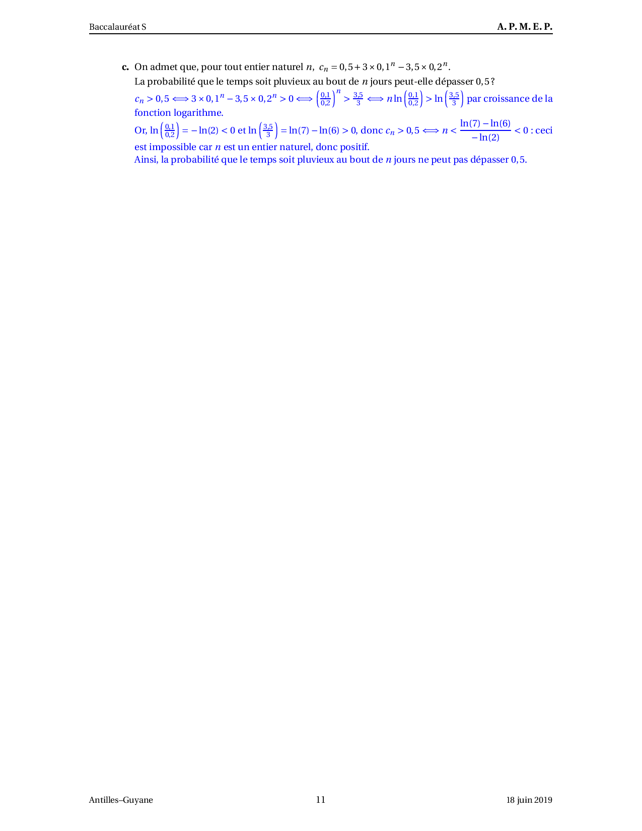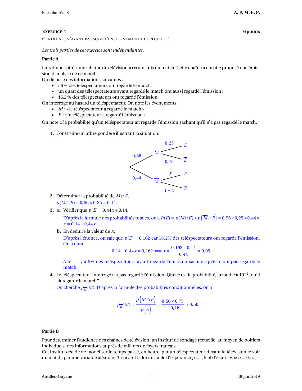 Annale Maths Bac S Antilles - Guyane juin 2019 - Corrigé