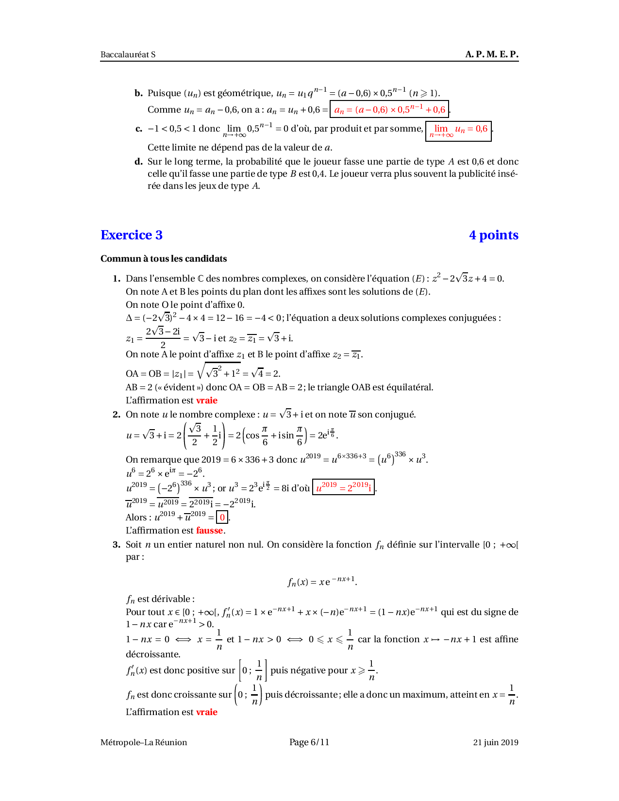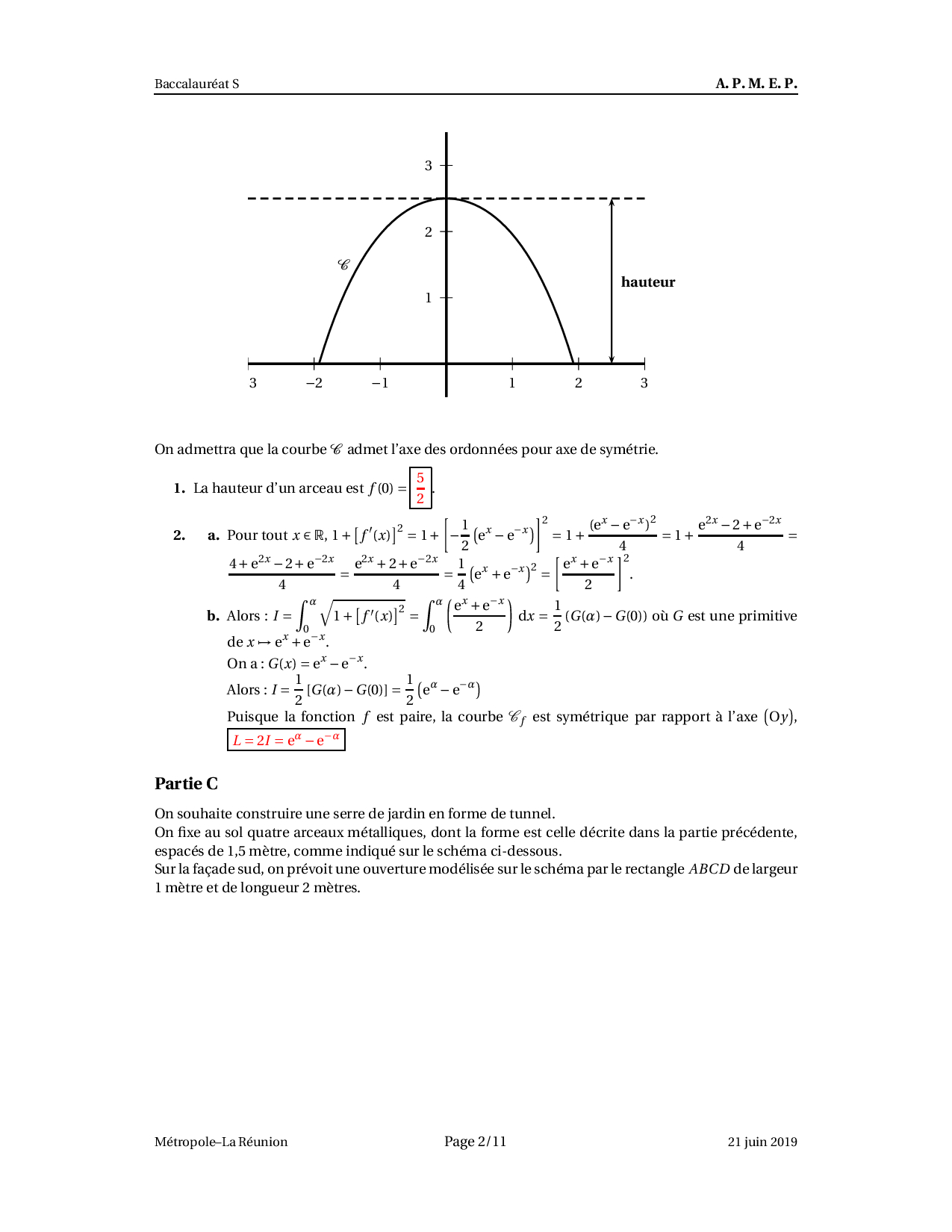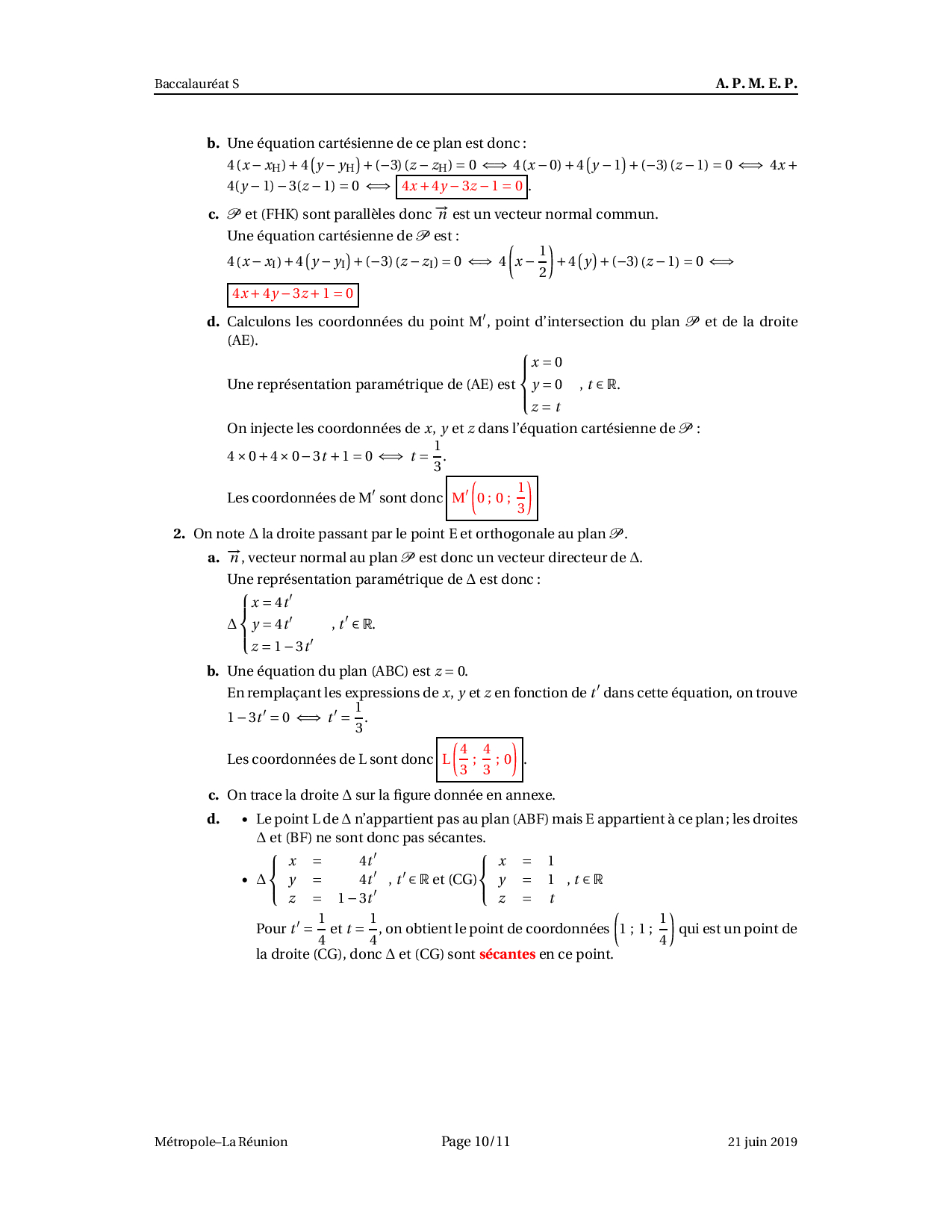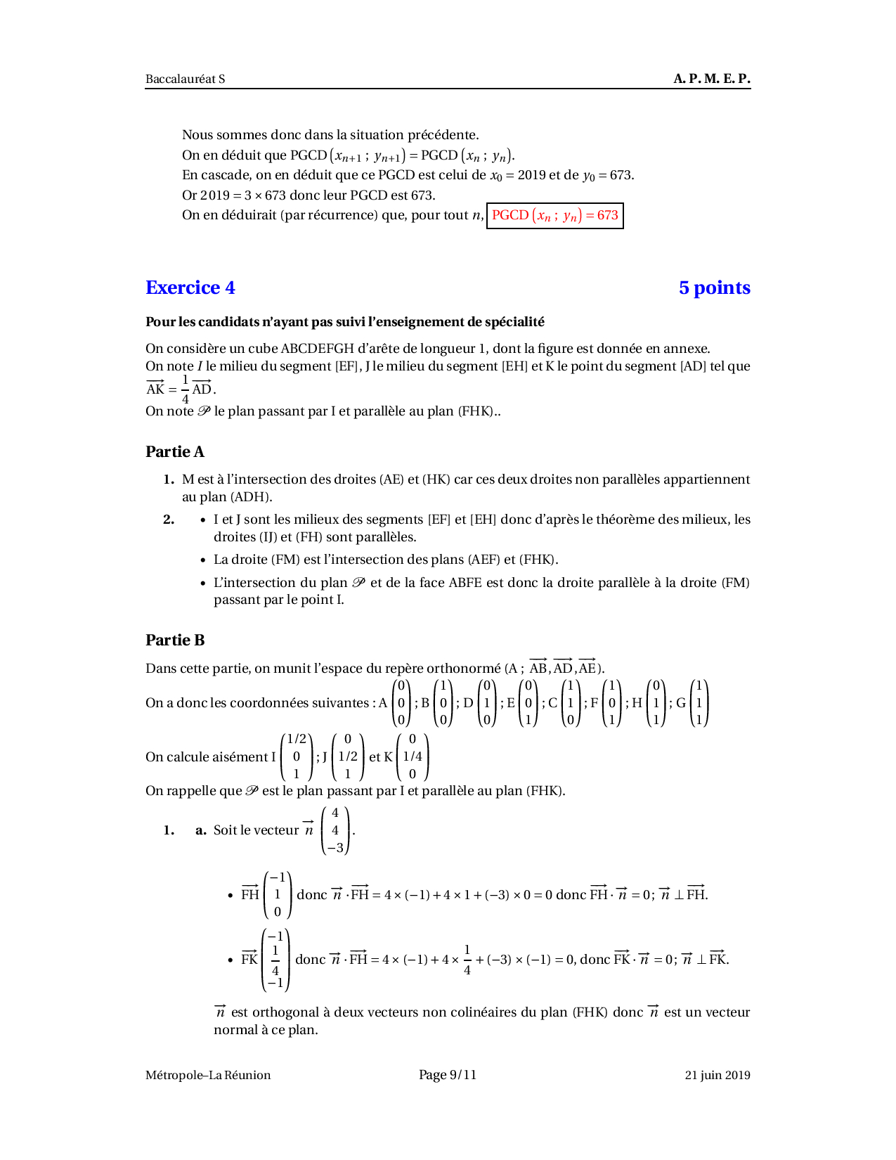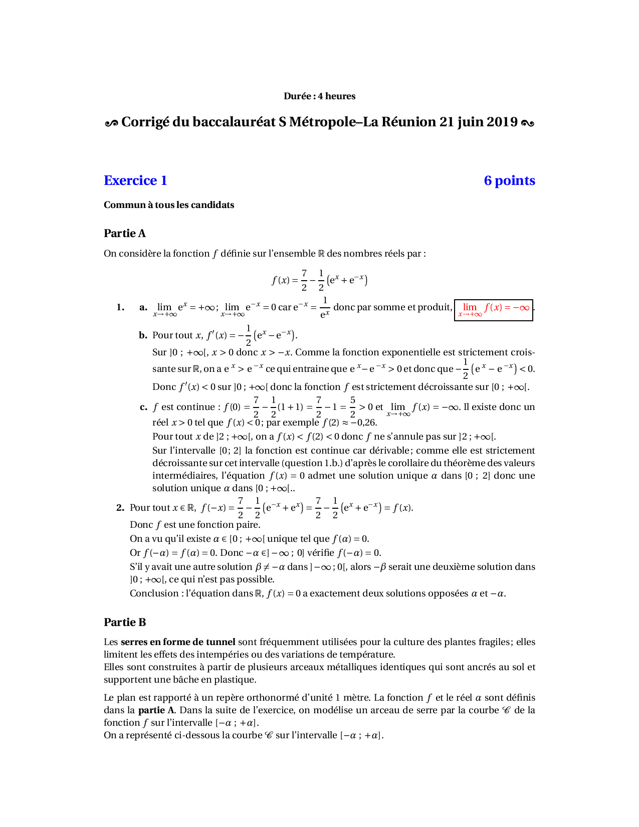 Annale Maths Bac S Métropole - La Réunion juin 2019 - Corrigé