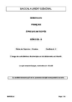 Bac S-ES Français (1ère) Liban 2019 - Sujet