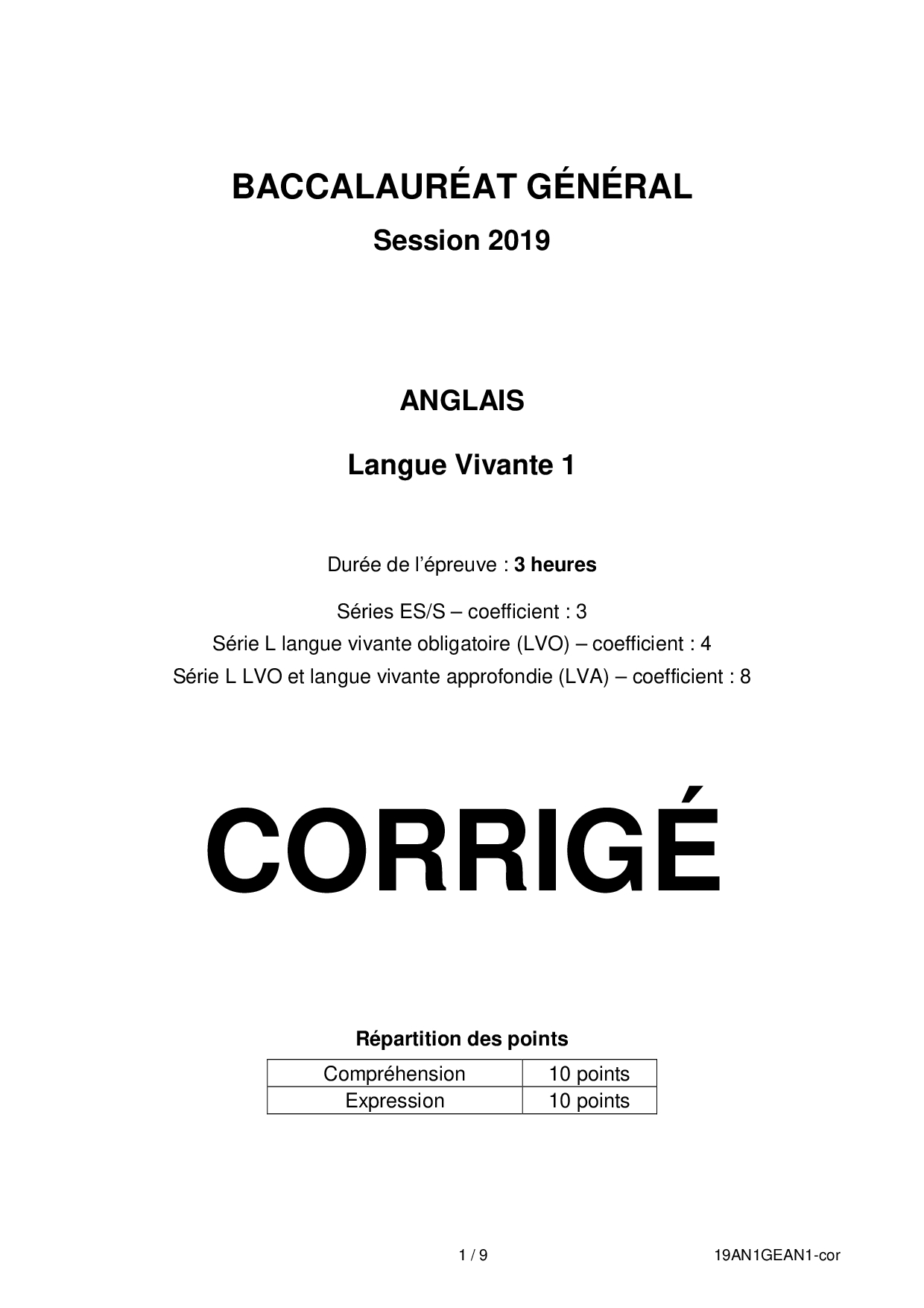 Bac S-ES-L Anglais LV1 Amérique du Nord 2019 - Corrigé