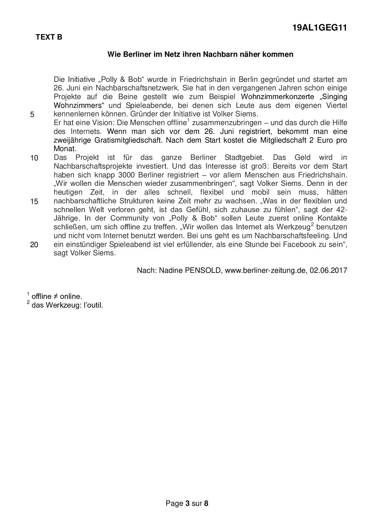 Bac S-ES-L Allemand LV1 Centres Etrangers Afrique 2019 - Sujet