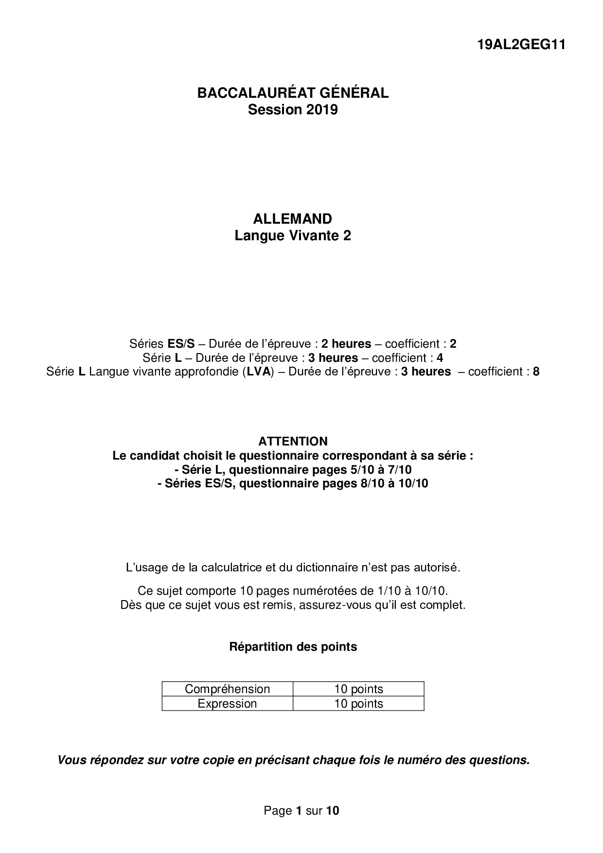 Bac S-ES-L Allemand LV2 Centres Etrangers Afrique 2019 - Sujet