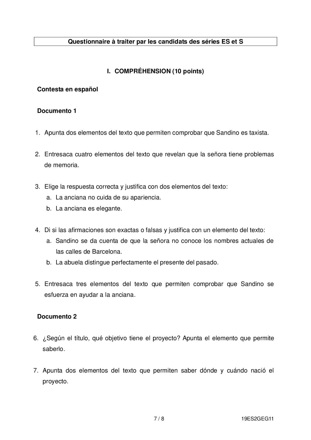Bac S-ES-L Espagnol LV2 Centres Etrangers Afrique 2019 - Sujet