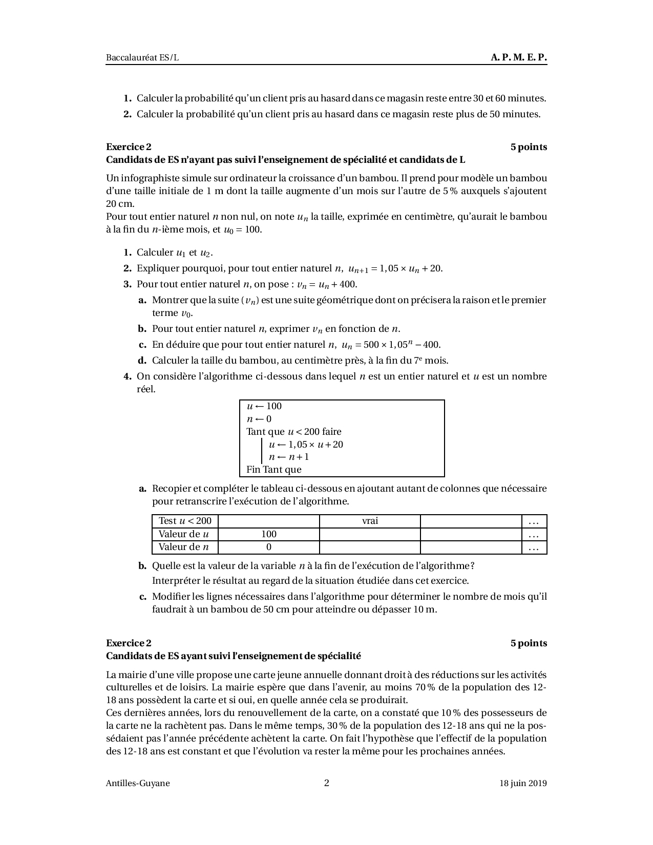 Annale Maths Bac ES-L Antilles—Guyane juin 2019 - Sujet