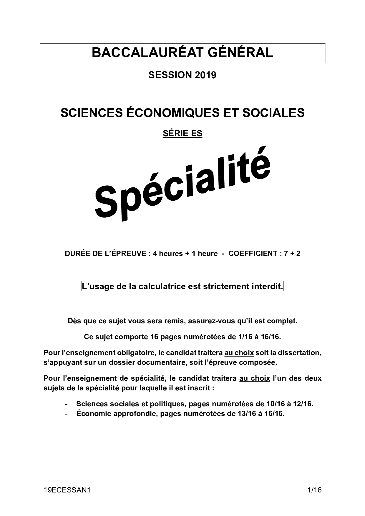 Bac ES Sciences Economiques et Sociales (SES Spécialité) Amérique du Nord 2019 - Sujet