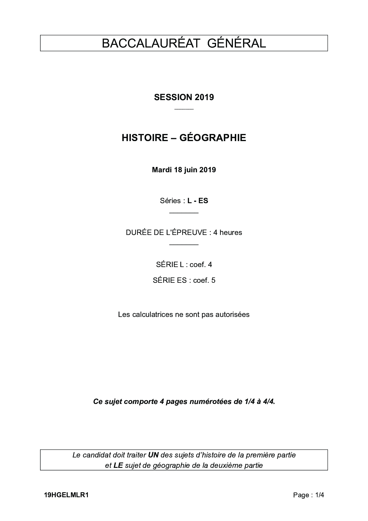 Bac ES-L Histoire Géographie Métropole 2019 - Sujet