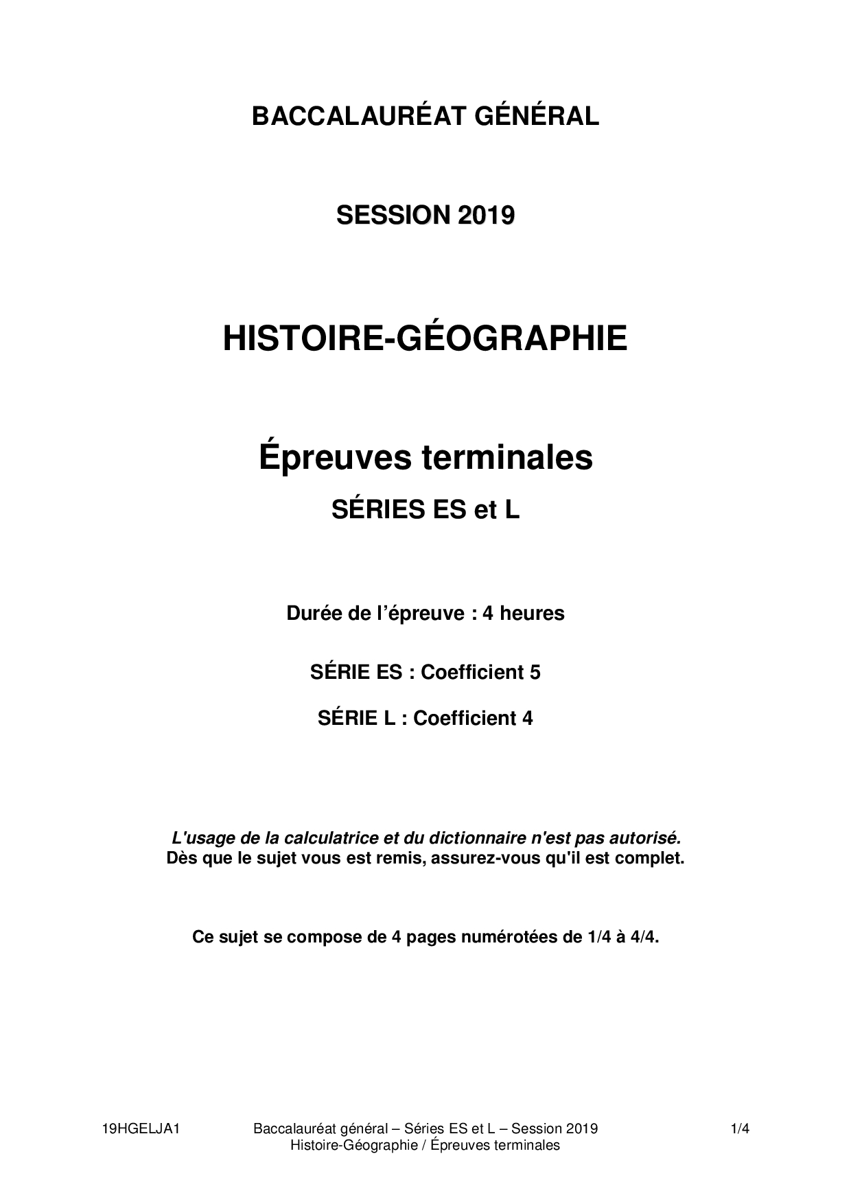 Bac ES-L Histoire Géographie Asie 2019 - Sujet
