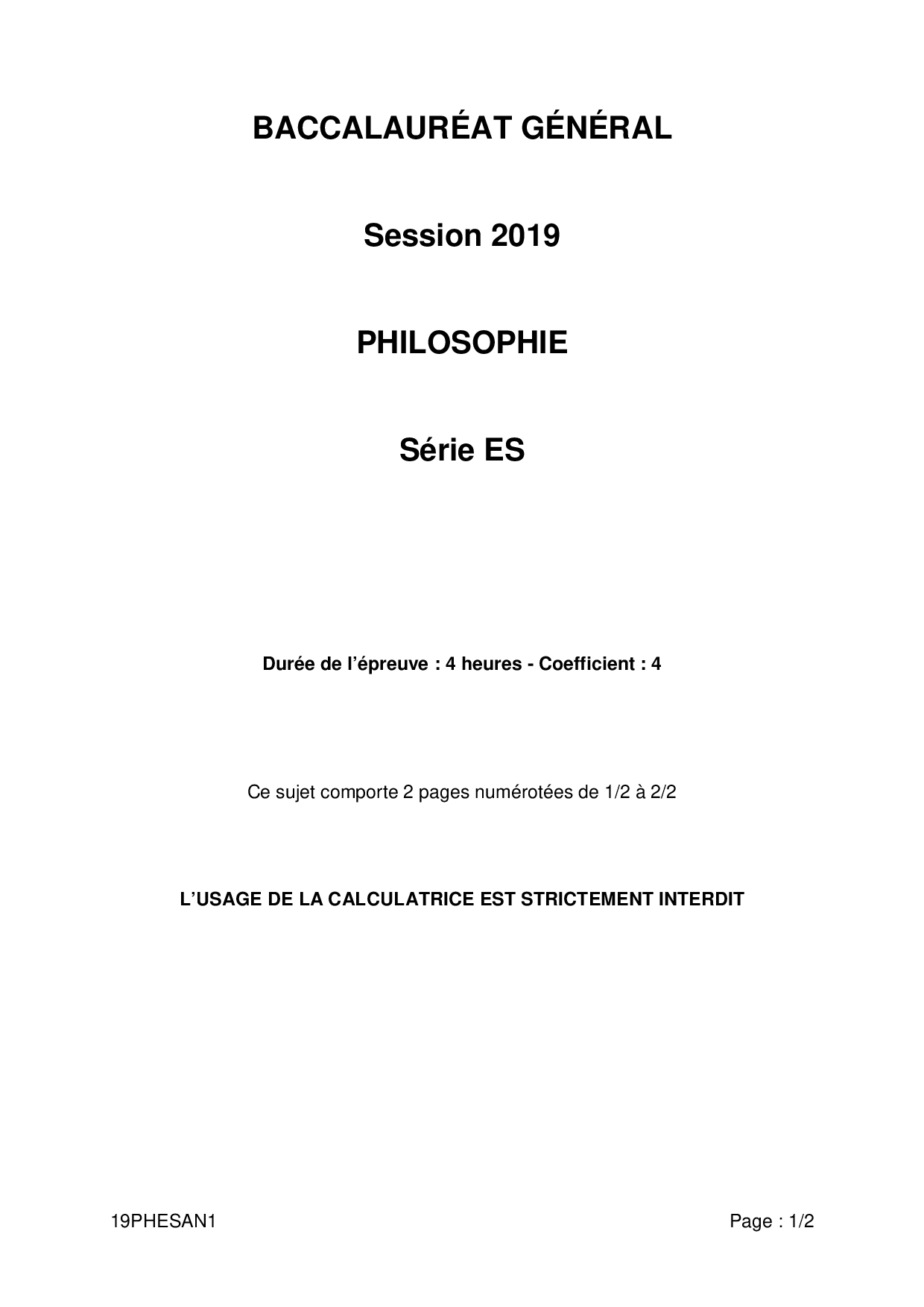 Bac ES Philosophie Amérique du Nord 2019 - Sujet