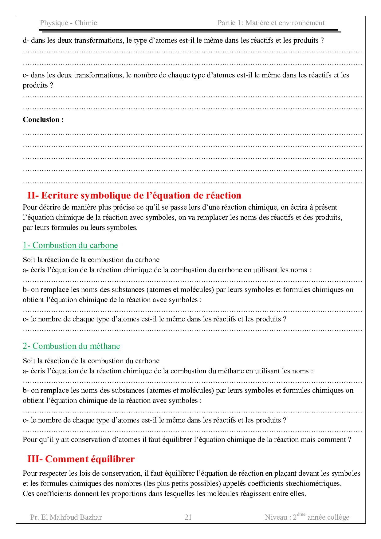 Les lois de la réaction chimique - Activités 1