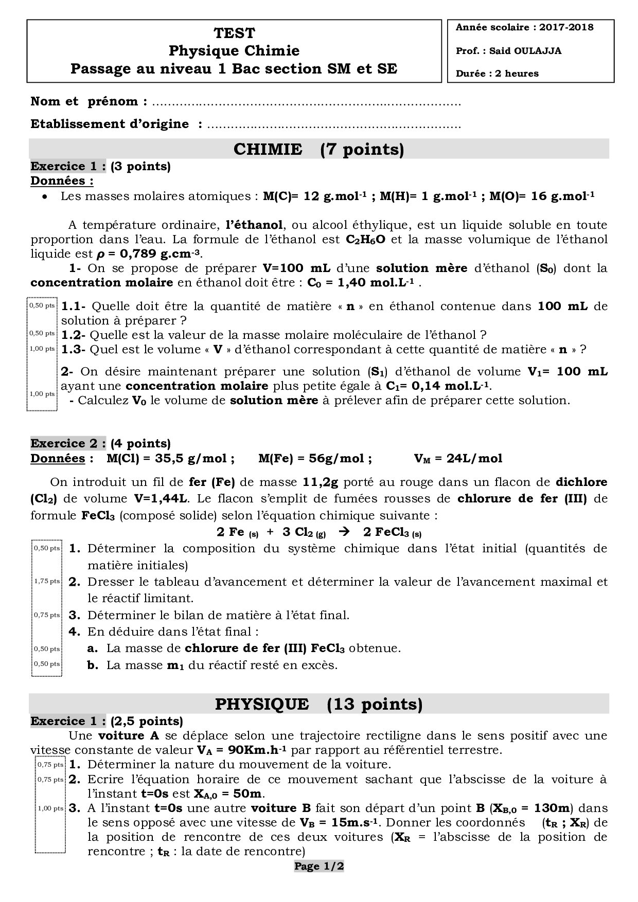 Physique-Chimie (1er Bac) - Évaluation diagnostique 3