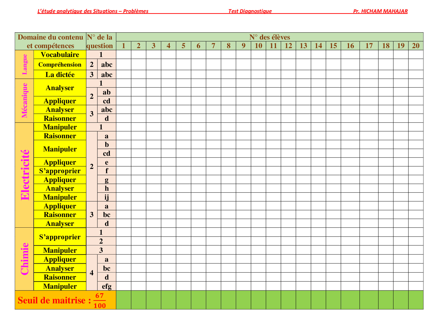 Physique-Chimie (2ème Bac) - Corrigé de l'évaluation diagnostique 1