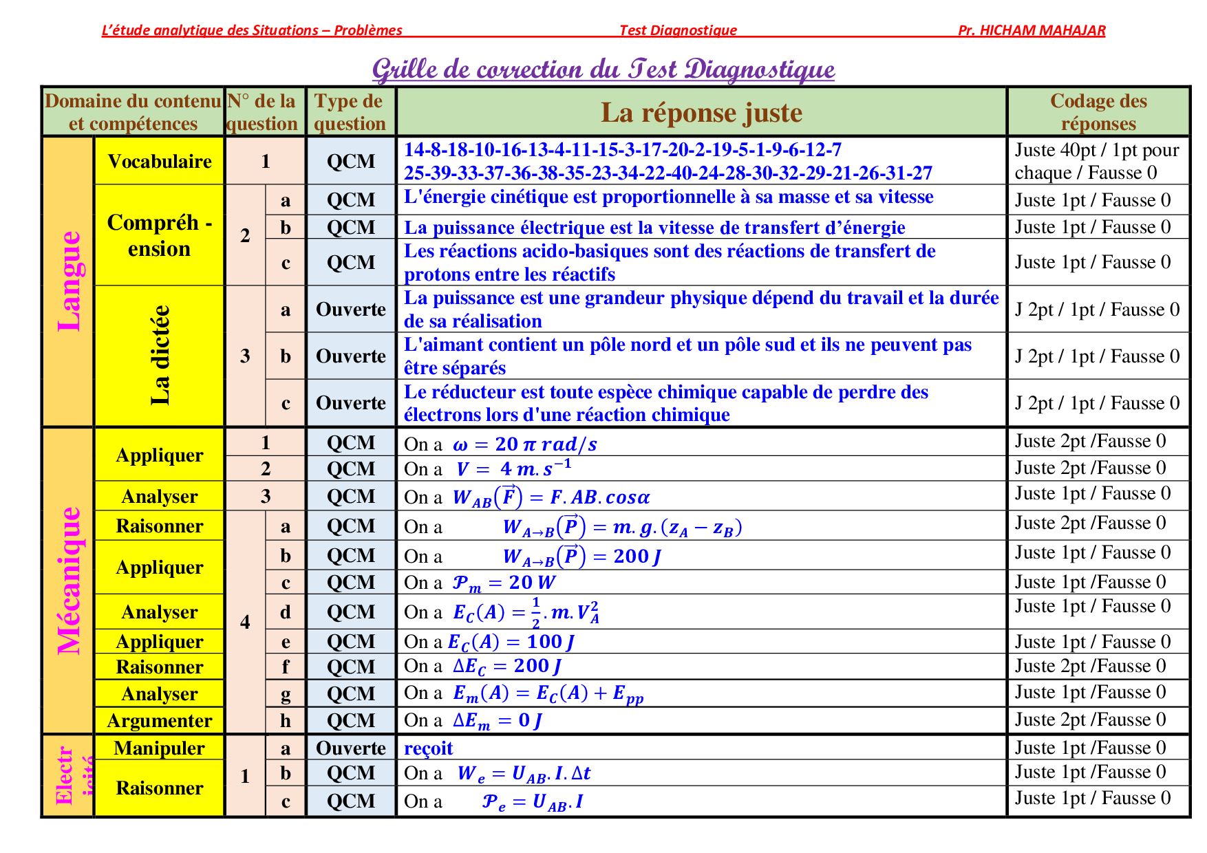 Physique-Chimie (2ème Bac) - Corrigé de l'évaluation diagnostique 2