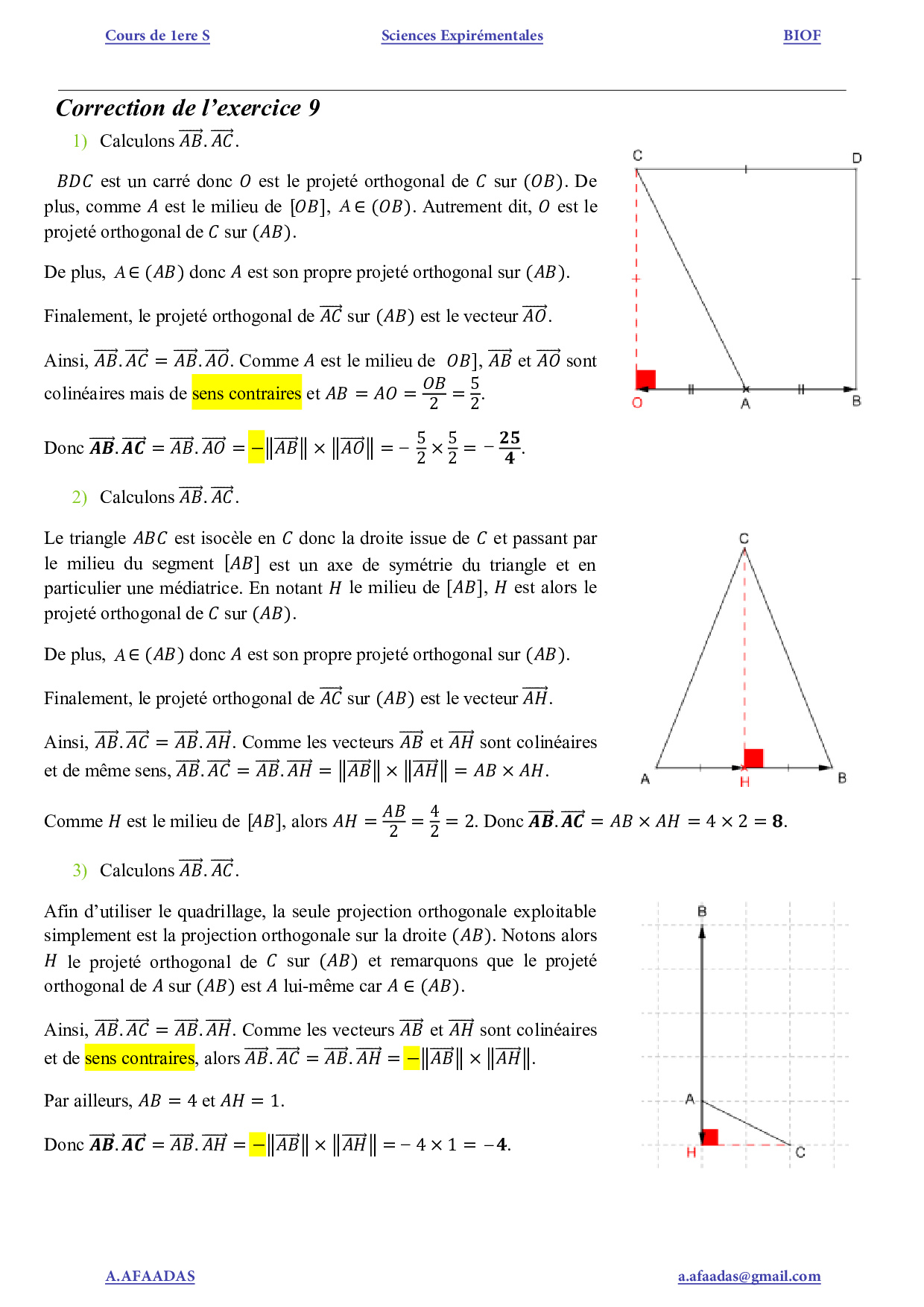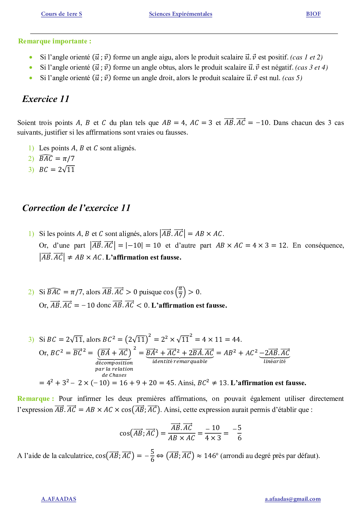 Le produit scalaire dans le plan - Exercices corrigés (FR)
