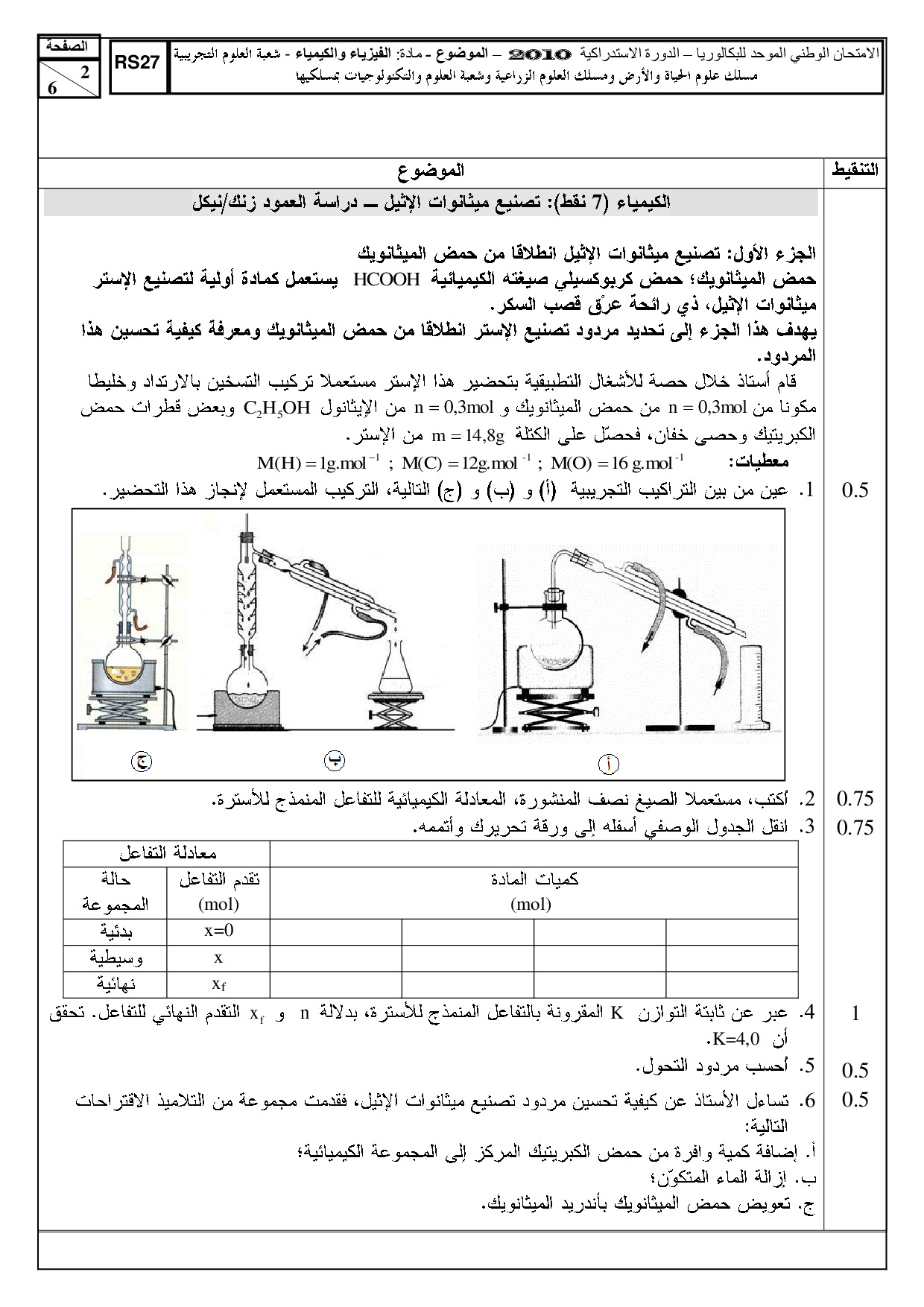 الفيزياء والكيمياء (علوم الحياة والأرض والعلوم والتكنولوجيات) 2010 الدورة الإستدراكية - الموضوع