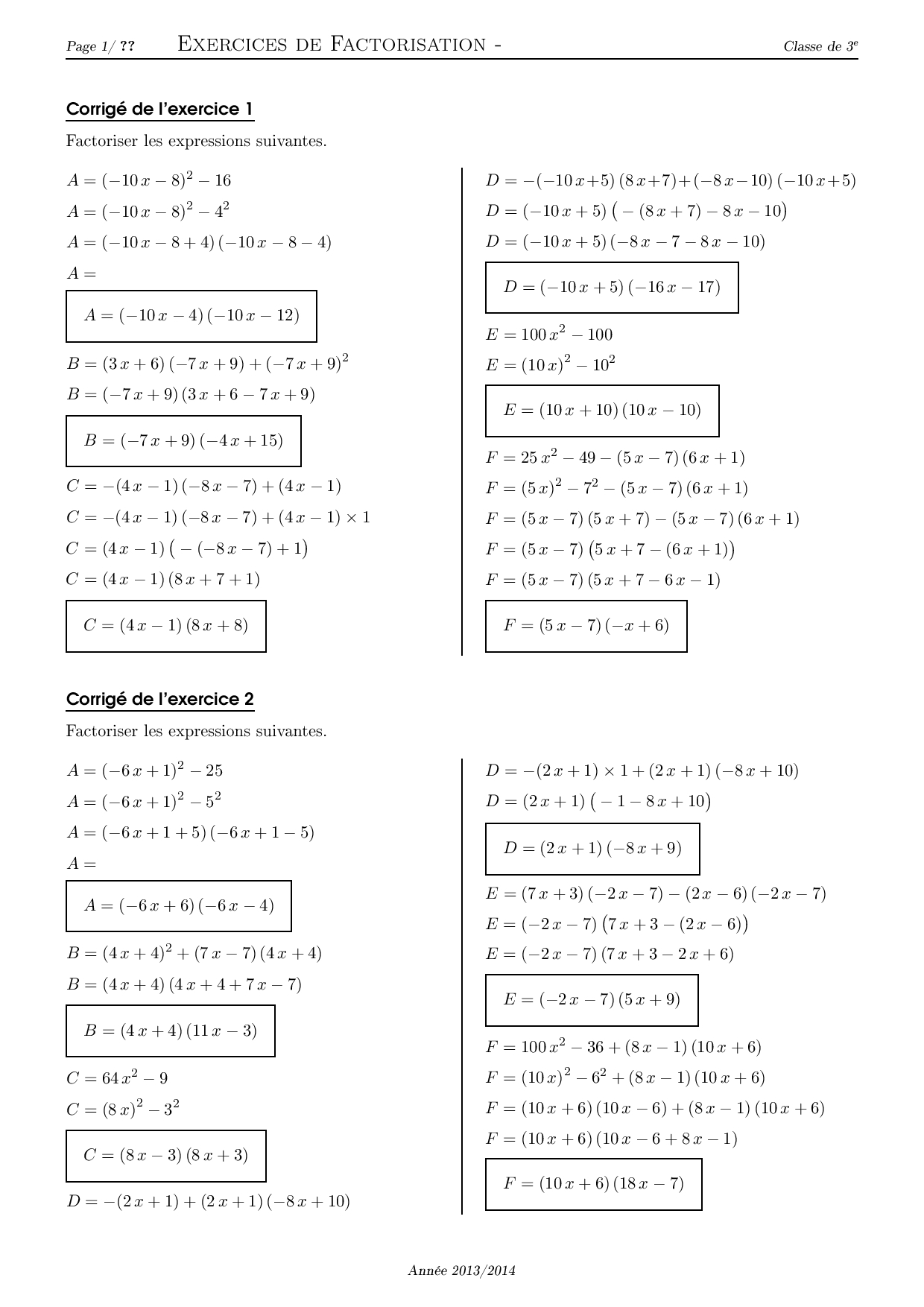 Factorisation - Corrigé série d'exercices 2