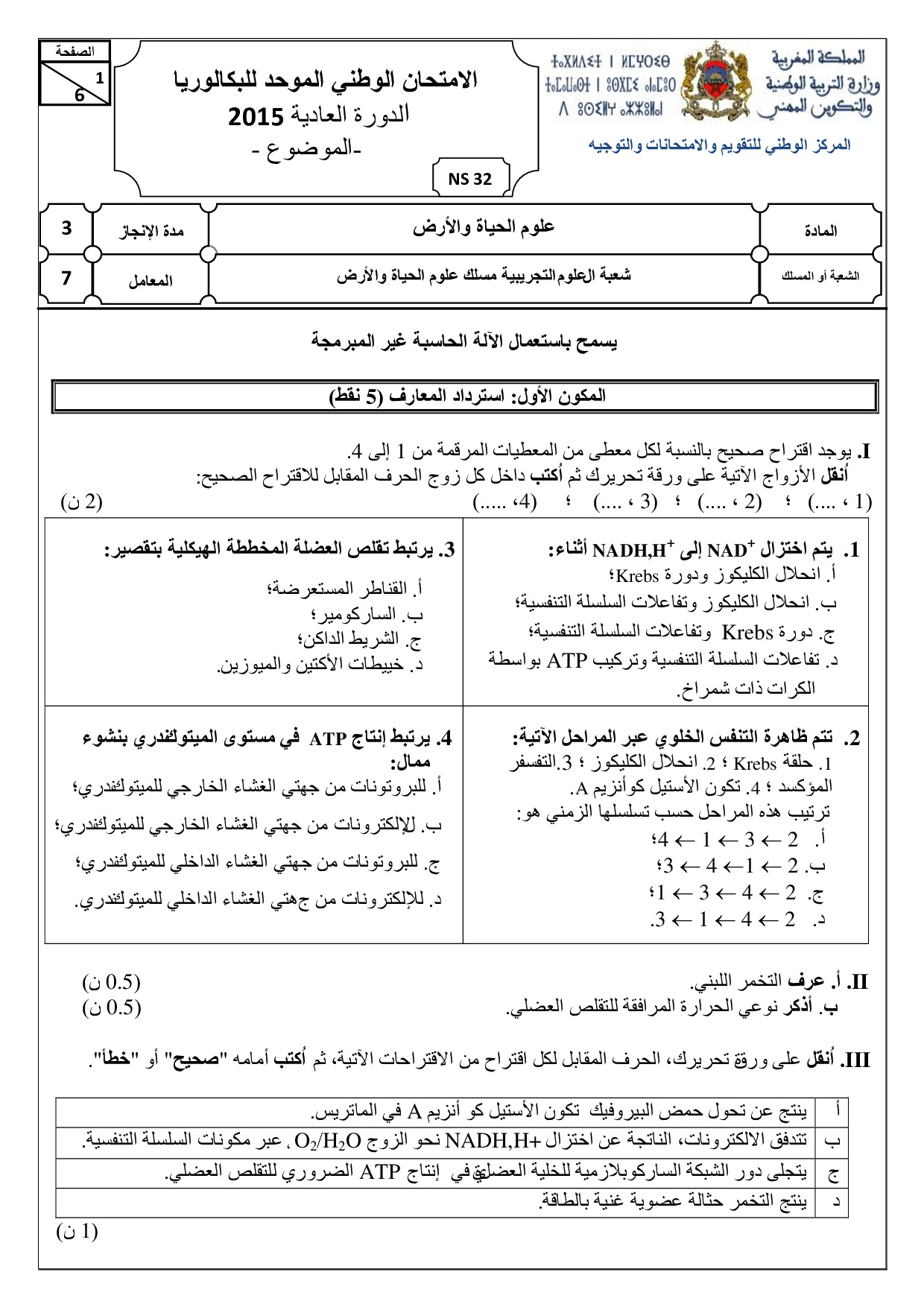 علوم الحياة والأرض (علوم الحياة والأرض) 2015 الدورة العادية - الموضوع