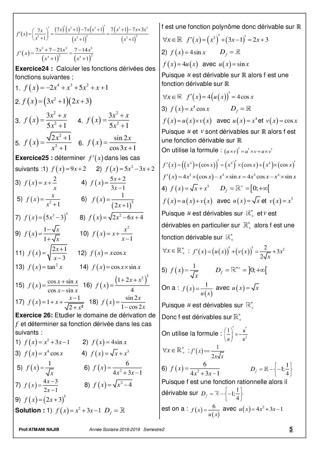 La dérivation - Corrigé série d'exercices 1