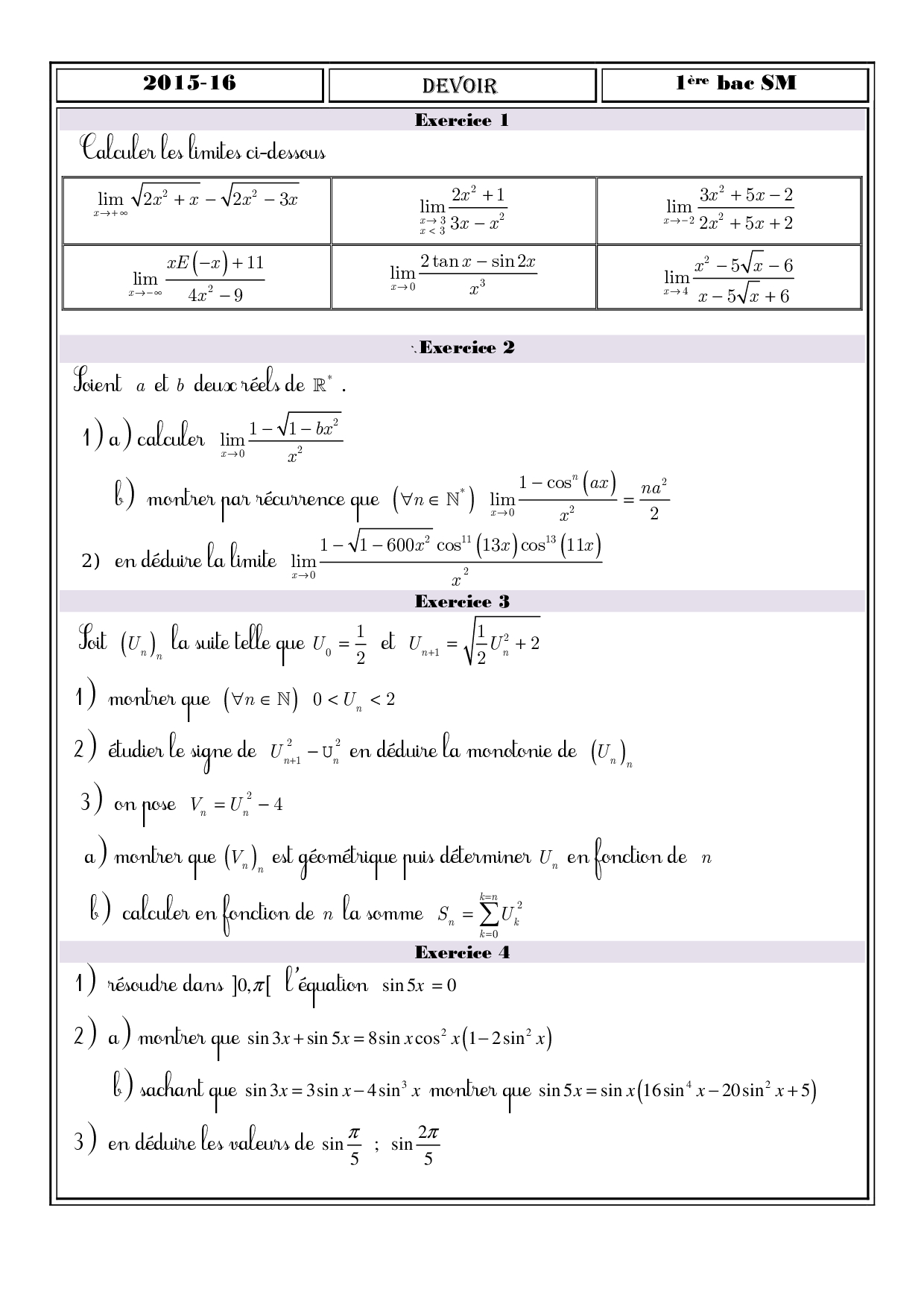 Devoir 1 Modèle 5 - Mathématiques 1 Bac SM Semestre 2