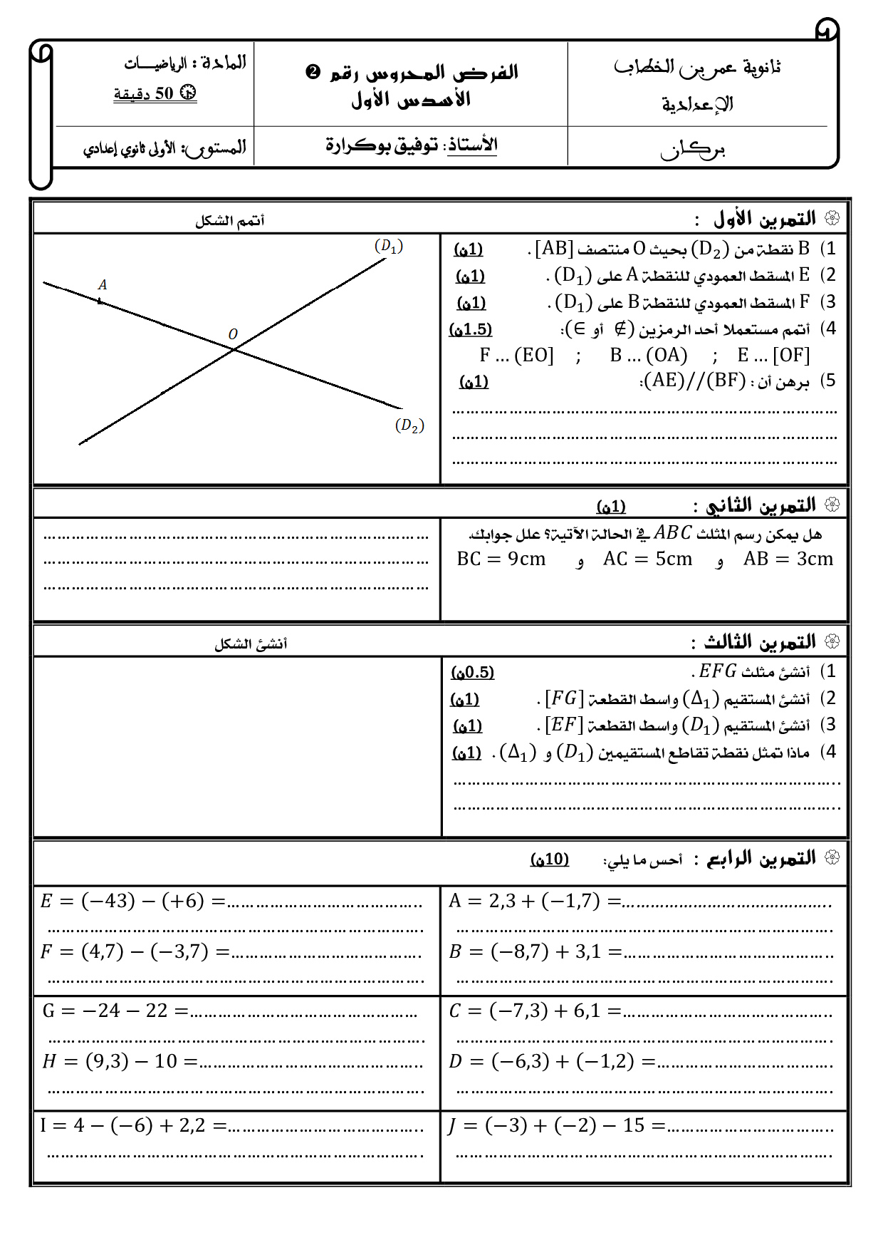 الفرض 2 نموذج 2 - الرياضيات أولى إعدادي الدورة الأولى