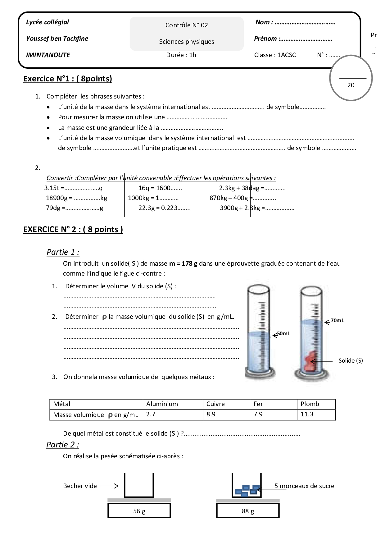 Devoir 2 Modèle 12 - Physique Chimie 1AC Semestre 1