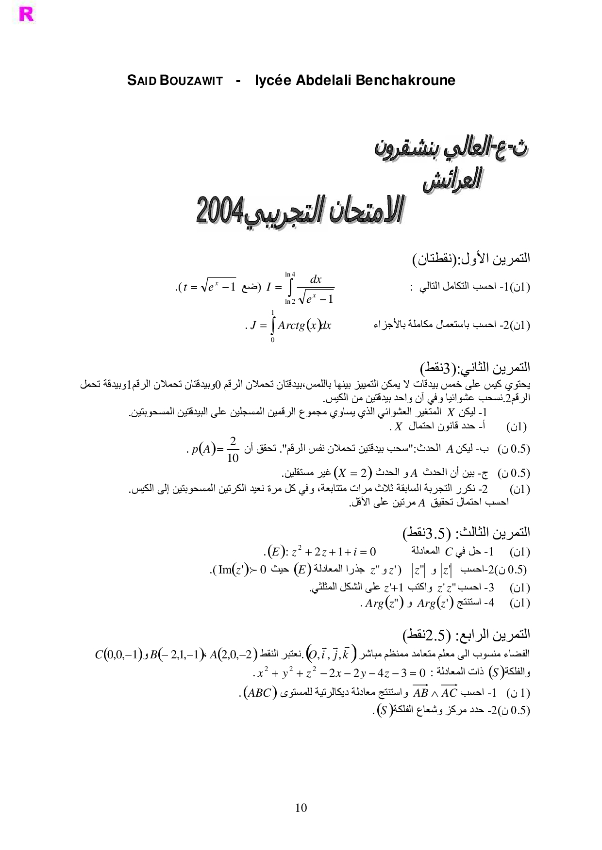 الامتحان التجريبي 4 - الرياضيات ثانية باك علوم وتقنيات (الموضوع)