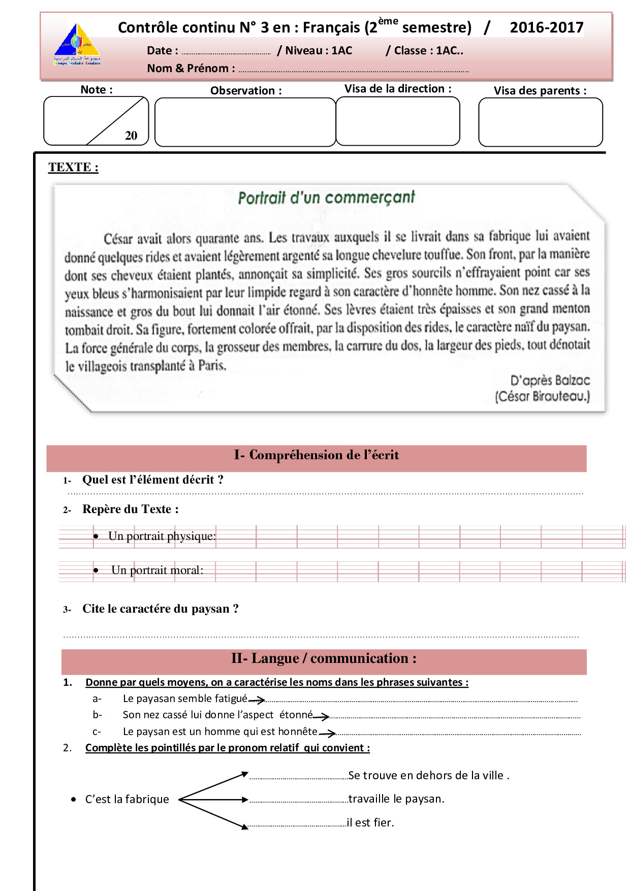 Devoir 3 Modèle 3 - Français 1AC Semestre 2