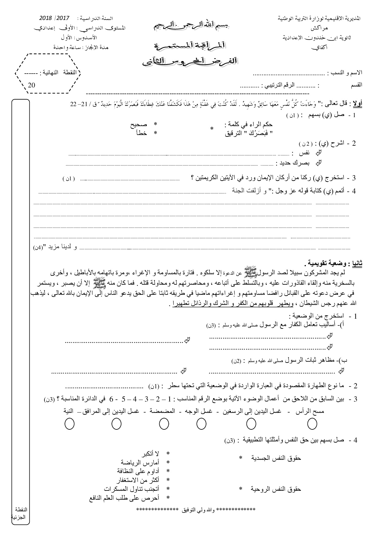 الفرض 2 نموذج 5 - التربية الإسلامية أولى إعدادي الدورة الأولى