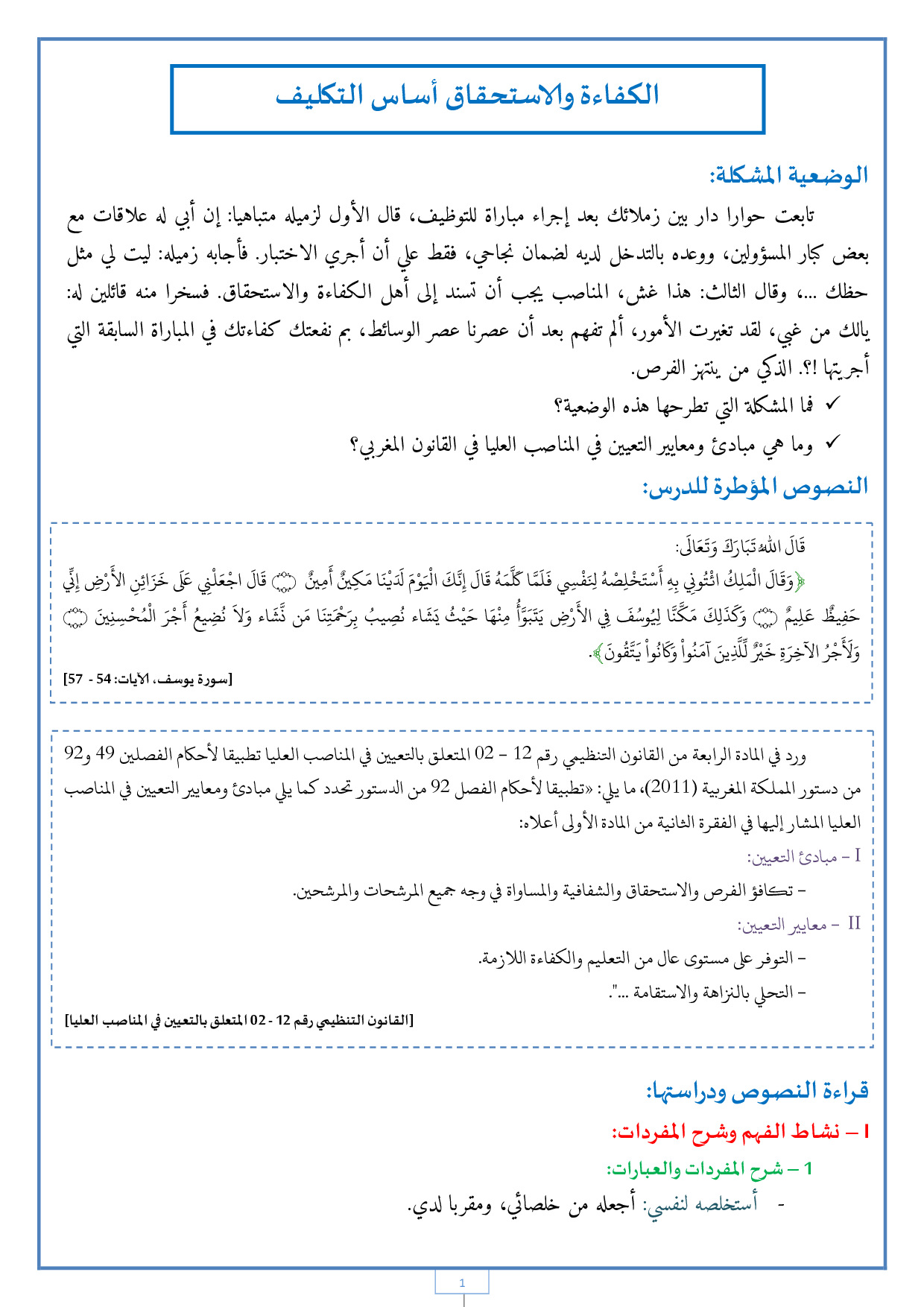 الكفاءة والاستحقاق أساس التكليف - الدرس
