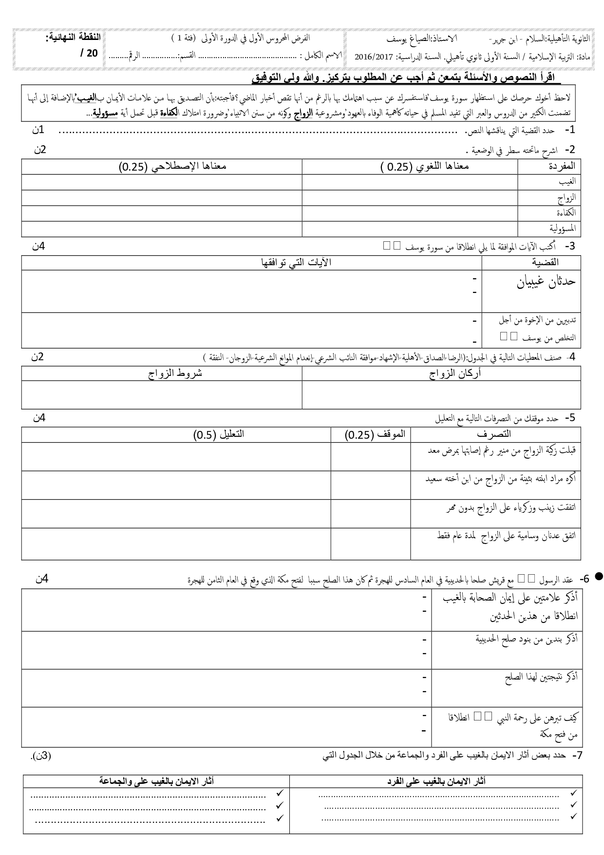 الفرض 1 نموذج 1 - التربية الإسلامية أولى باك الدورة الأولى