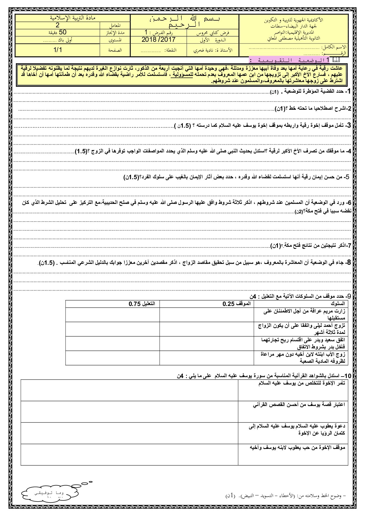 الفرض 1 نموذج 6 - التربية الإسلامية أولى باك الدورة الأولى