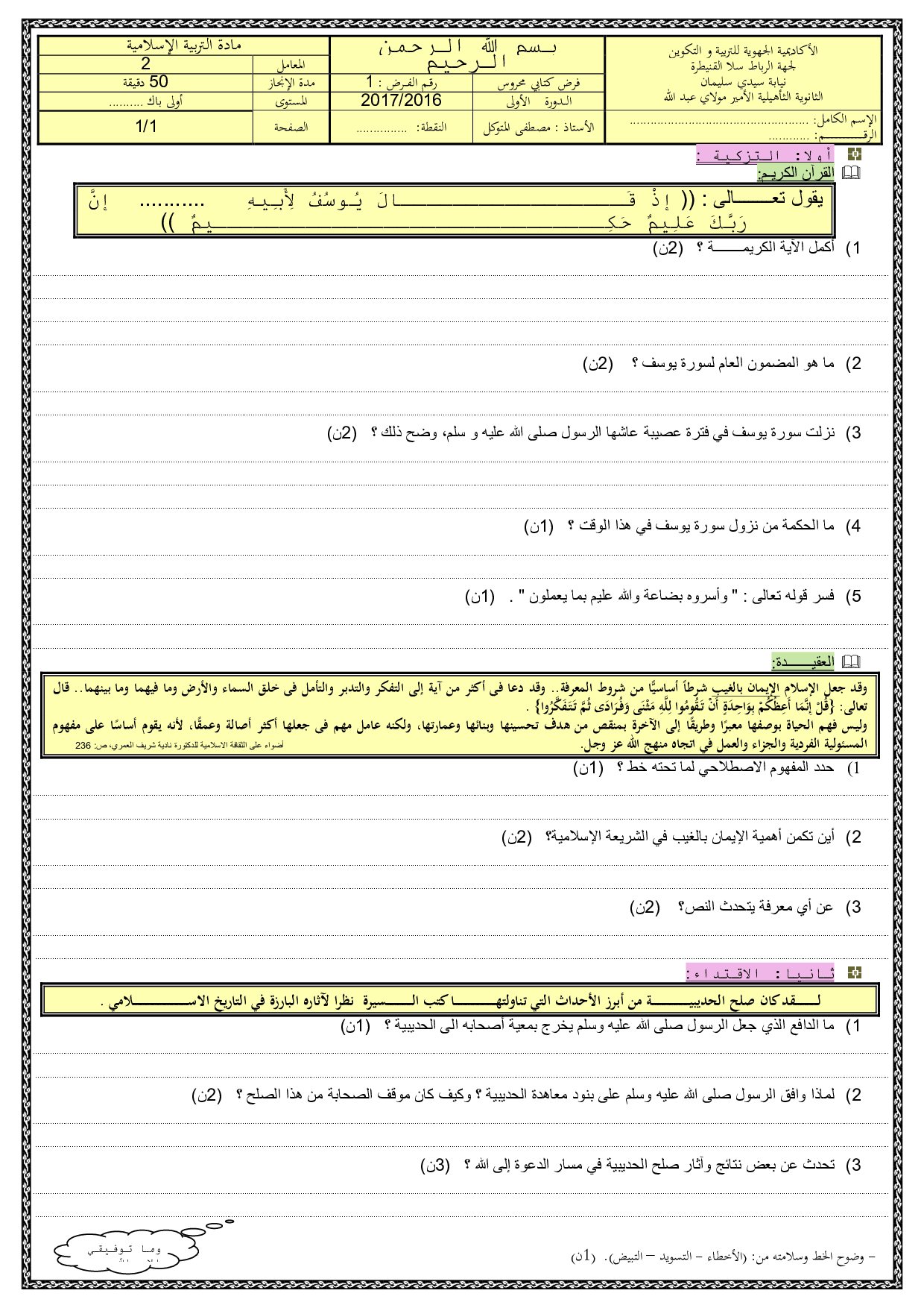 التربية الإسلامية: الأولى باك علوم رياضية
