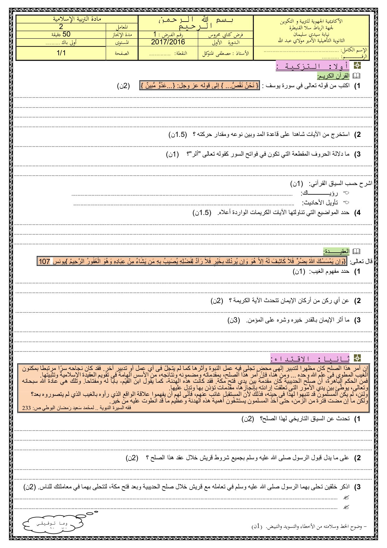الفرض 1 نموذج 10 - التربية الإسلامية أولى باك الدورة الأولى