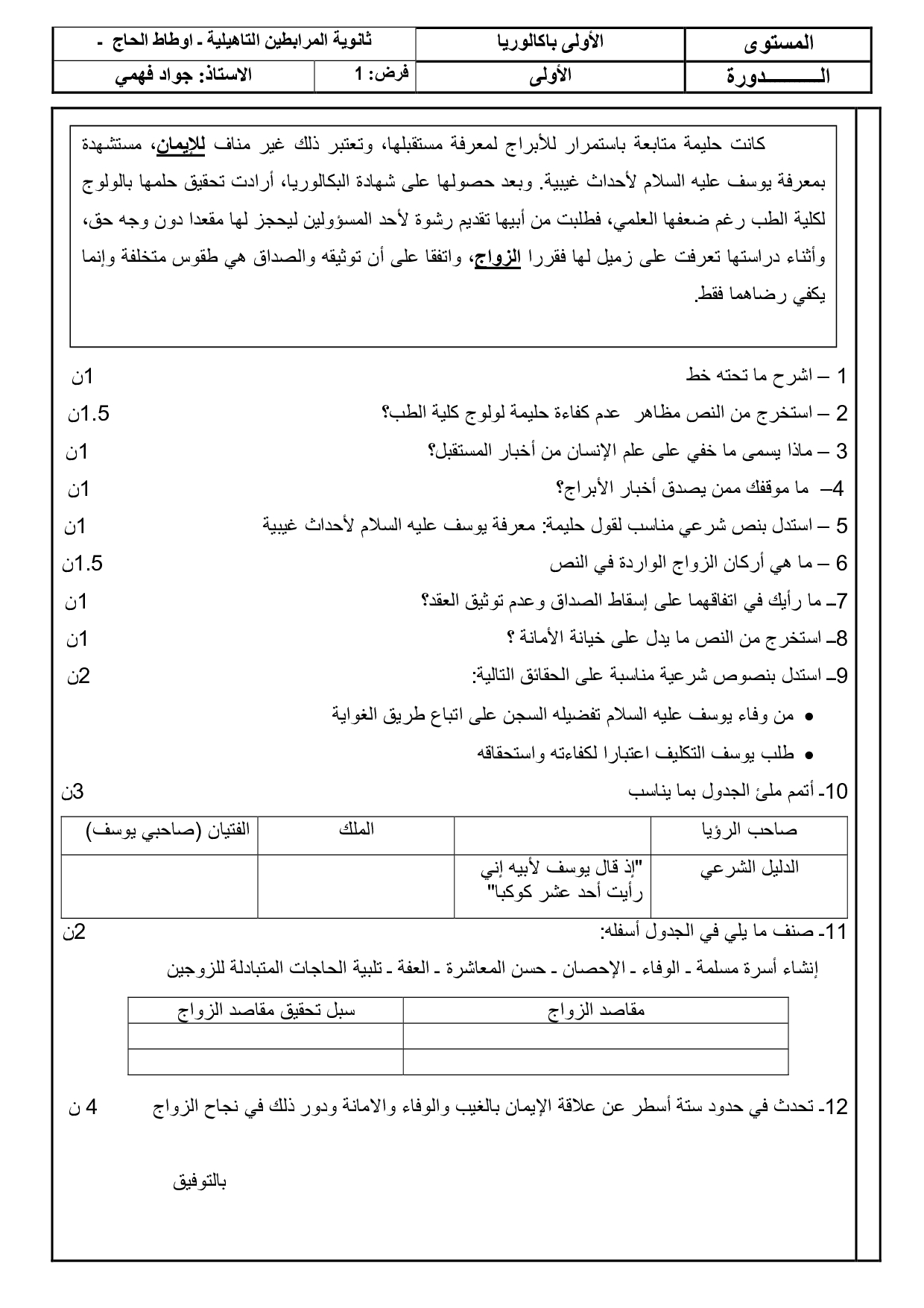 الفرض 1 نموذج 11 - التربية الإسلامية أولى باك الدورة الأولى
