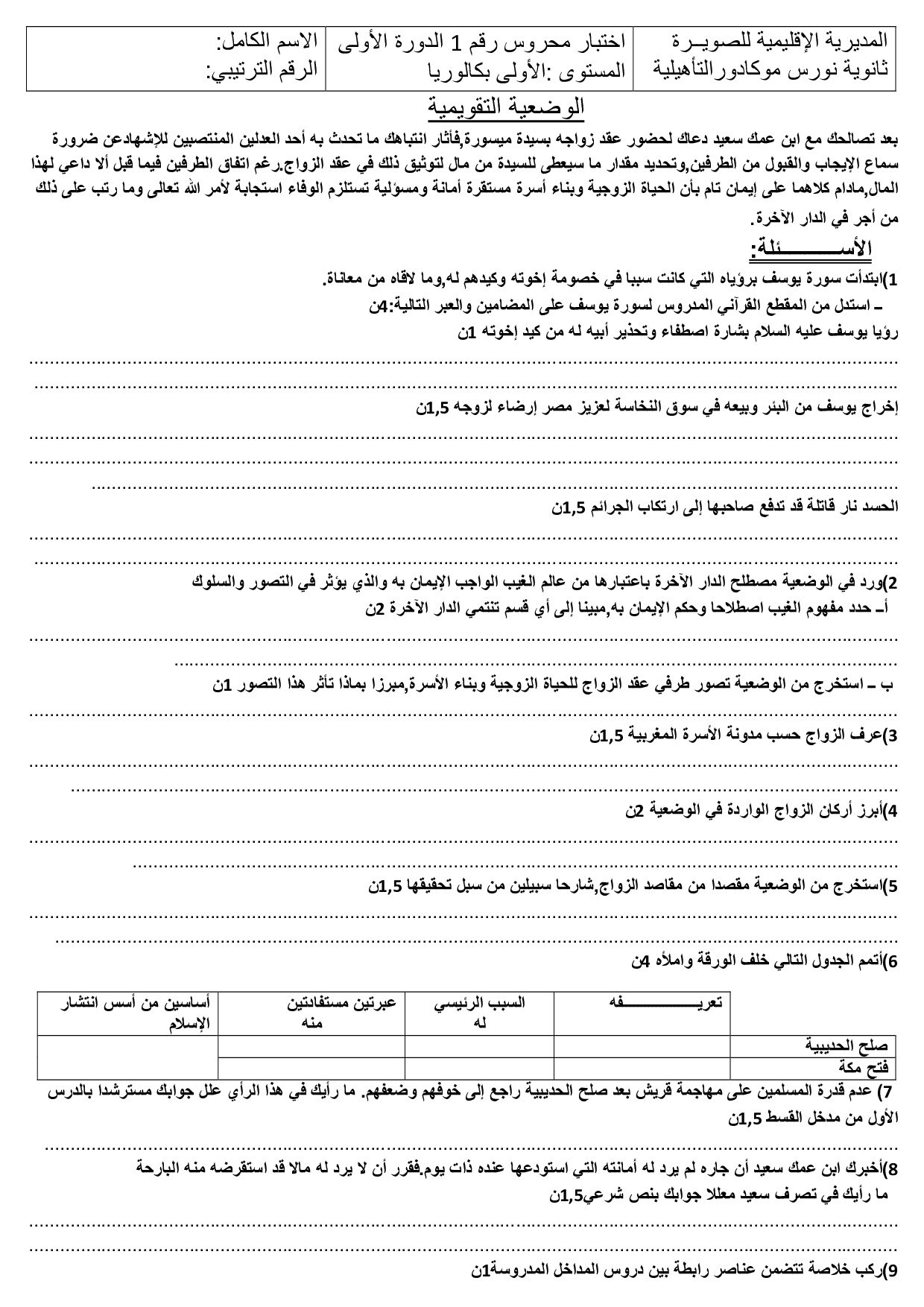 الفرض 1 نموذج 12 - التربية الإسلامية أولى باك الدورة الأولى