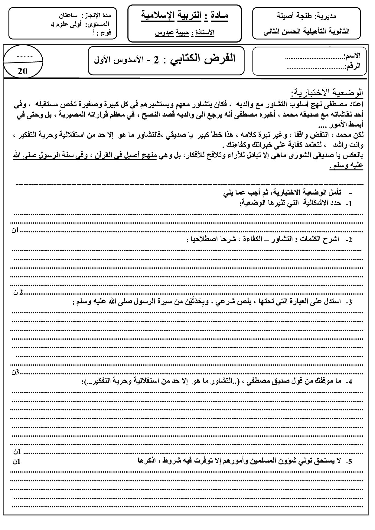 الفرض 2 نموذج 2 - التربية الإسلامية أولى باك الدورة الأولى