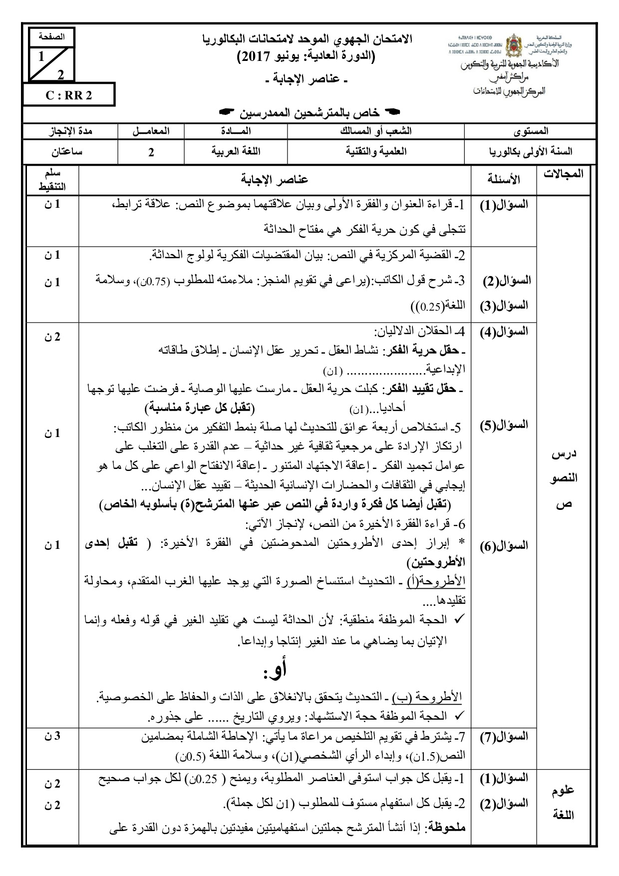 الامتحان الجهوي في اللغة العربية (د. العادية) - مراكش آسفي 2017 - التصحيح