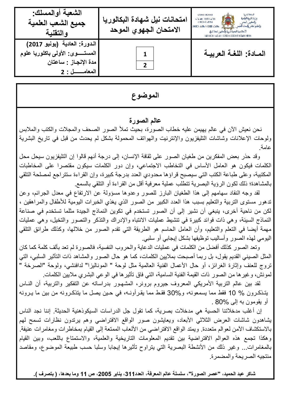 الامتحان الجهوي في اللغة العربية (د. العادية) - الشرق 2017 - الموضوع