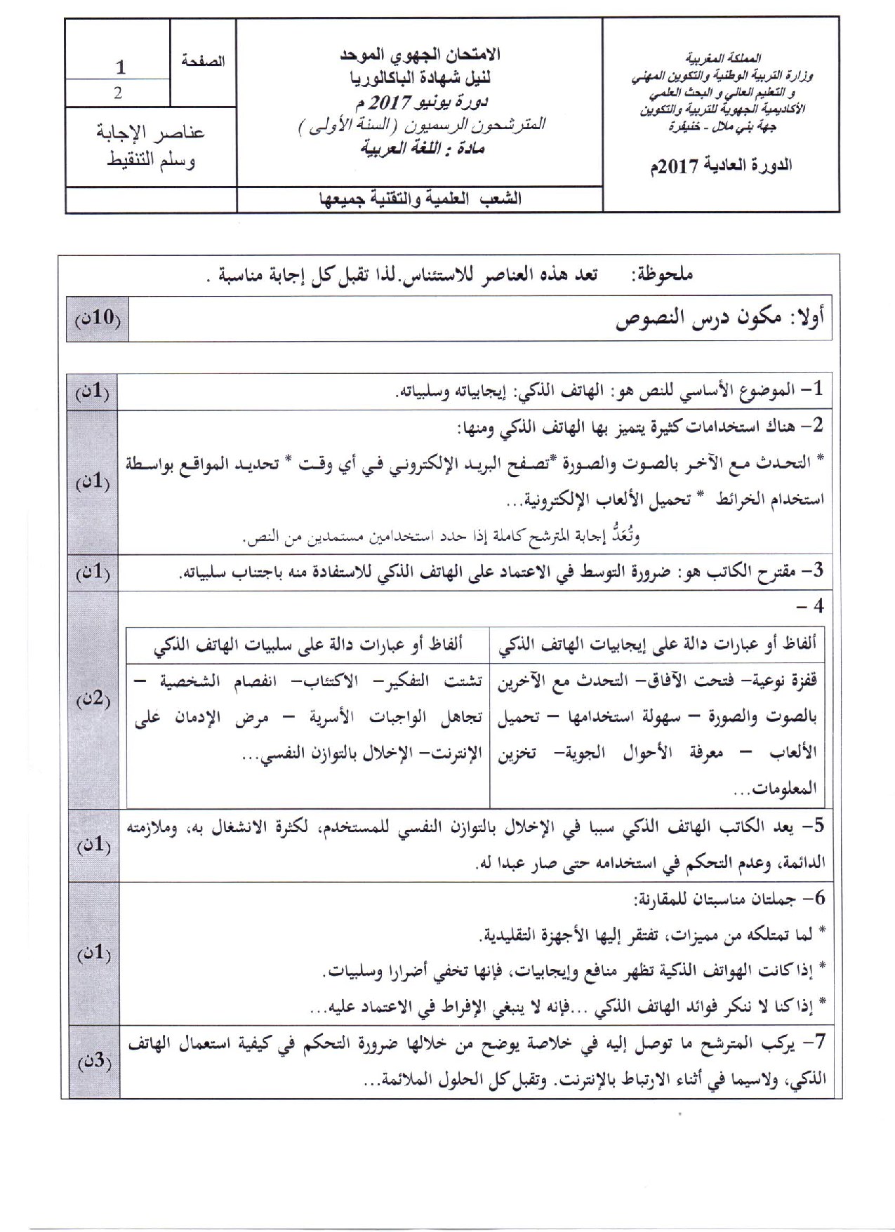 الامتحان الجهوي في اللغة العربية (د. العادية) - بني ملال خنيفرة 2017 - التصحيح