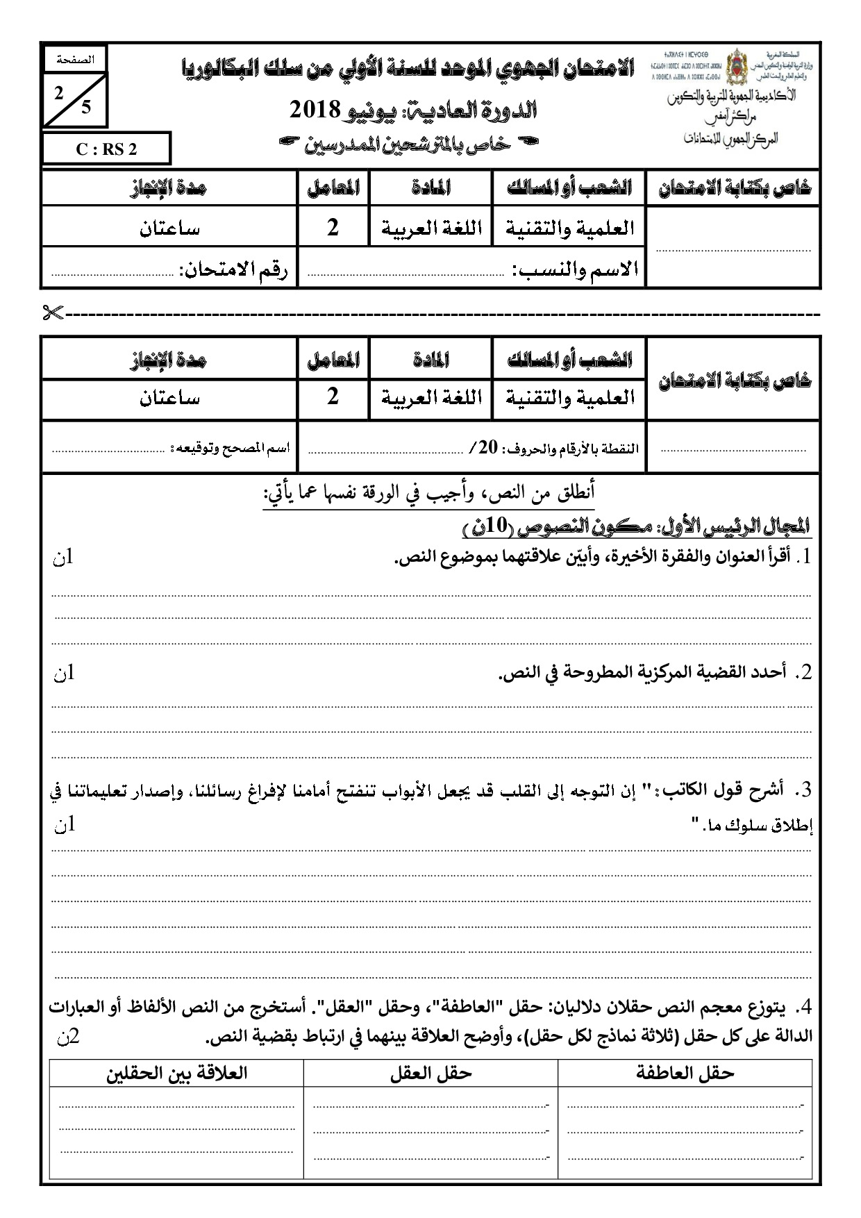 الامتحان الجهوي في اللغة العربية (د. العادية) - مراكش آسفي 2018 - الموضوع
