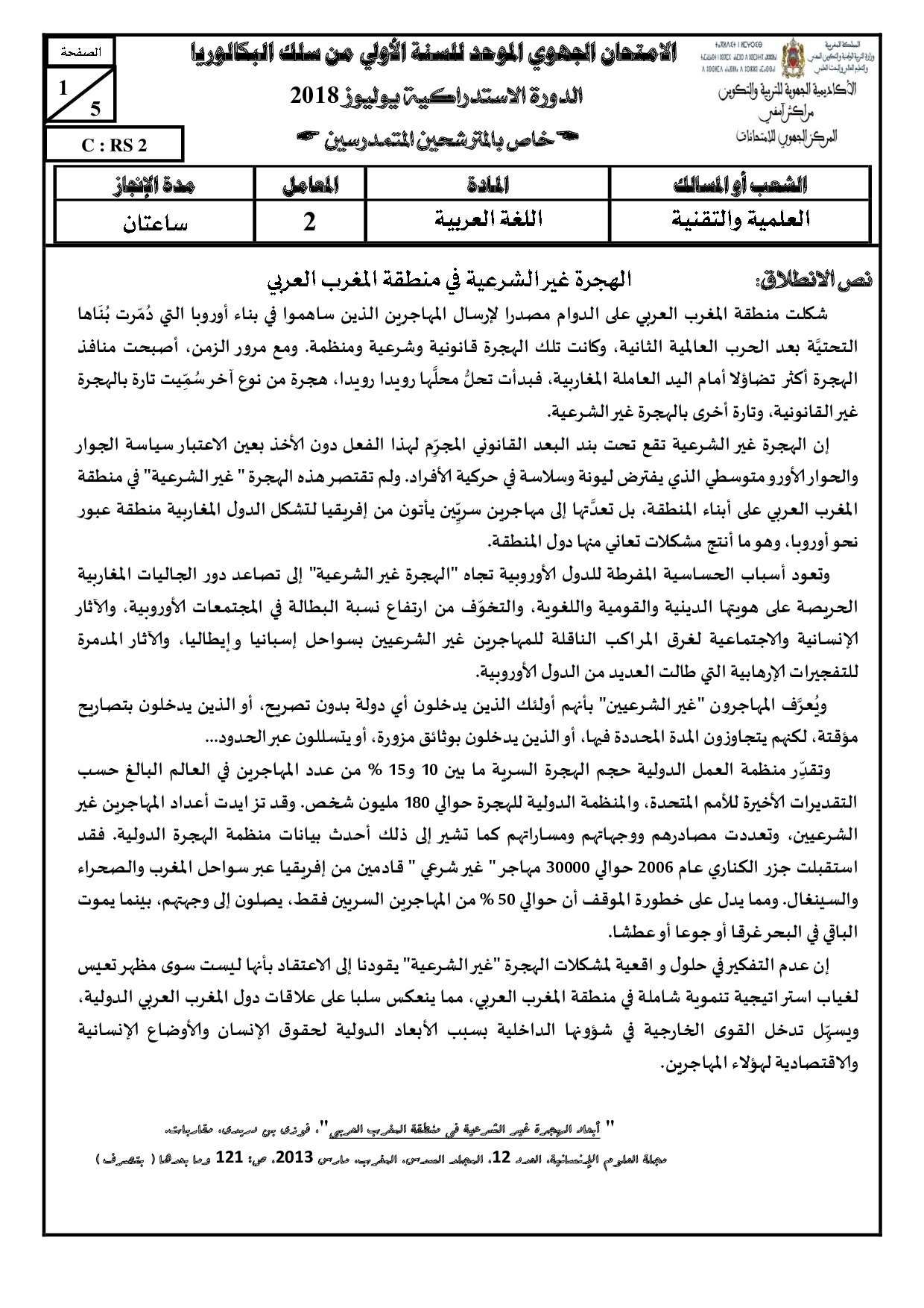 الامتحان الجهوي في اللغة العربية (د. الإستدراكية) - مراكش آسفي 2018 - الموضوع